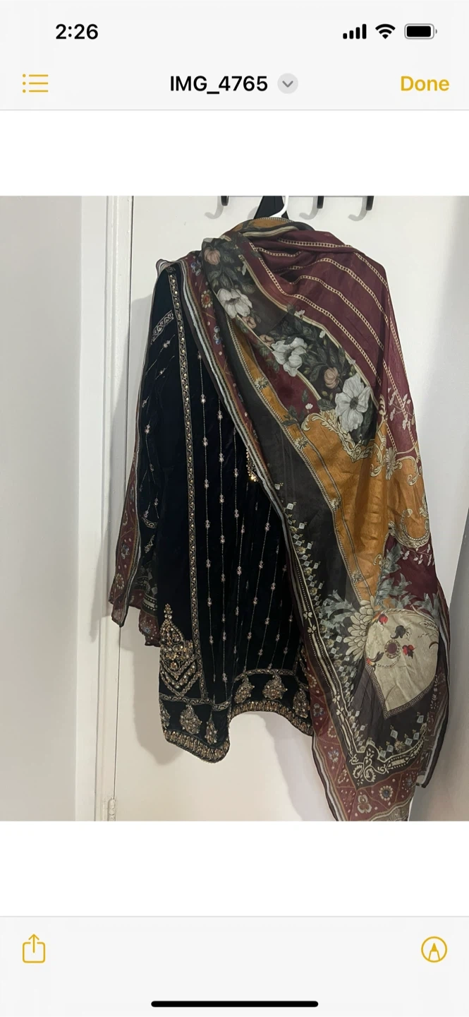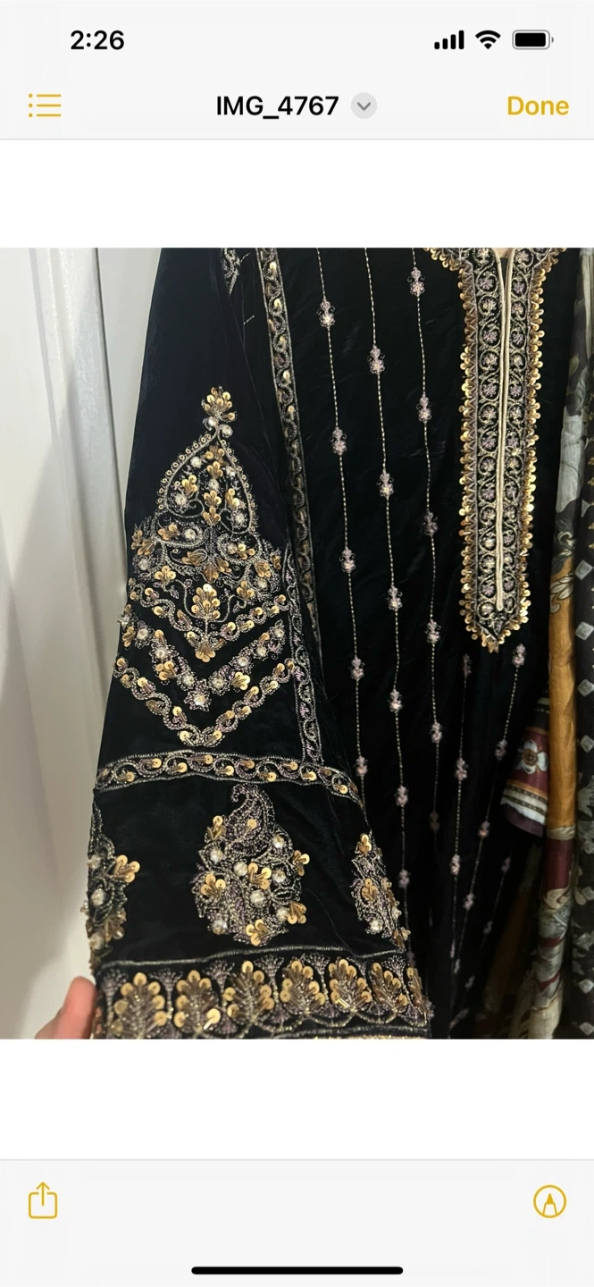23Selling a beautiful black velvet Suit with intricate gold embroidery. The fabric is soft and luxurious, perfect for a special occasion. Comes with a matching dupatta. It's in great condition.