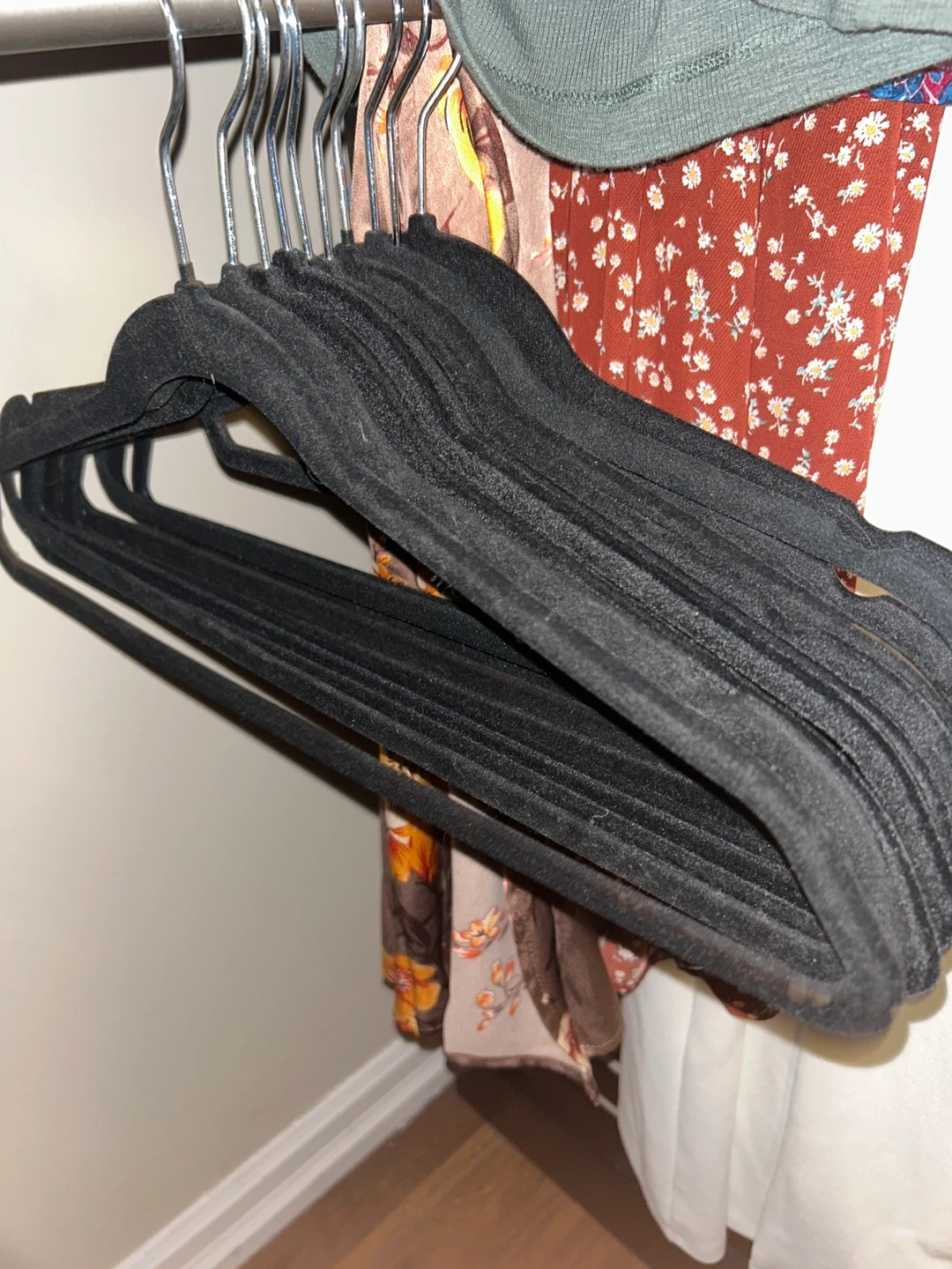111Selling a set of black velvet hangers! They're great for keeping clothes from slipping and saving space in your closet 10 for 5.00
