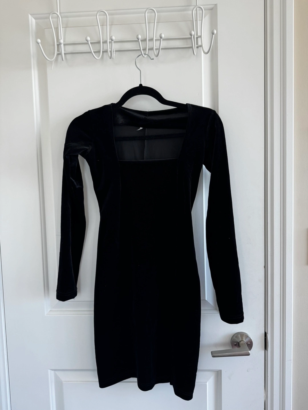 26Long sleeve mini dress. Square neckline. Velvet material. Form-fitting.