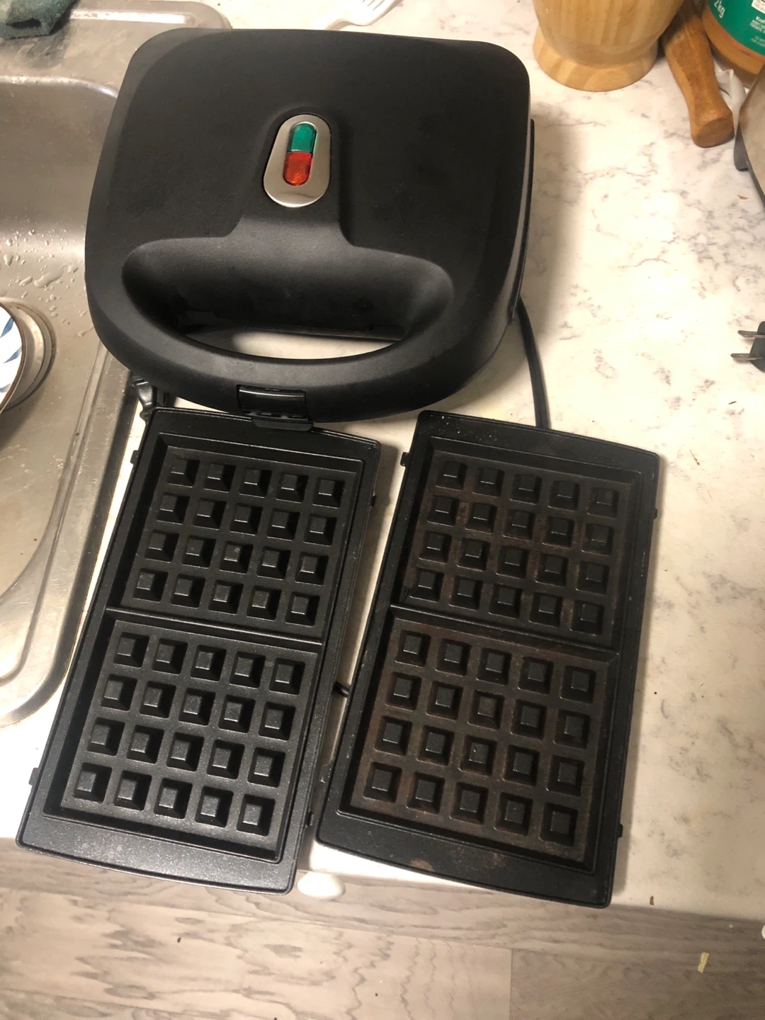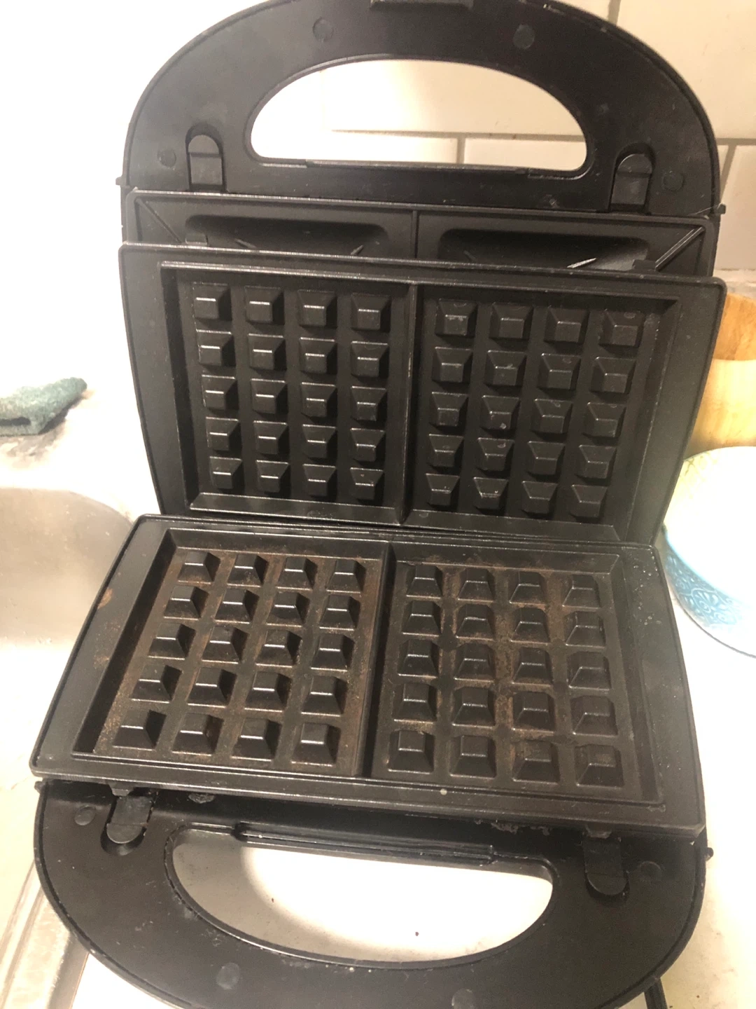 Selling a waffle maker! It's black and ready to make some delicious waffles. It has some signs of use on the plates, but it still works great for making waffles