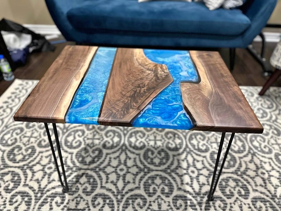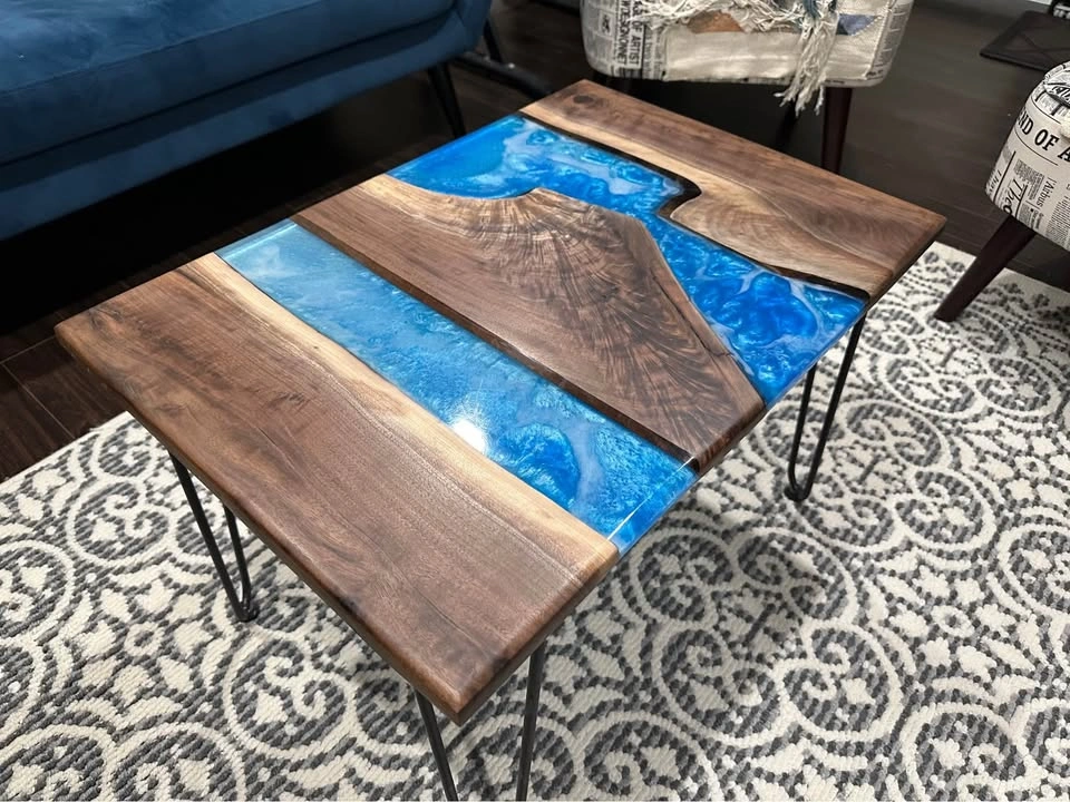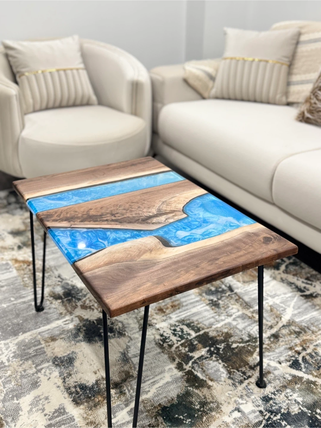 One-of-a-kind live edge Black Walnut epoxy river table – handcrafted with stunning natural wood grain and a sparkling blue mirror-finish epoxy river. ✨ Features: • Dimensions: ~70 cm x 50 cm x 1.5 inches • Premium Black Walnut live edge slabs • Deep, glossy epoxy finish (glass-like shine) • Sturdy black hairpin legs for a modern touch • Fully polished & ready to use This is not a mass-produced table – it’s a unique piece of functional art. The natural edges of the Black Walnut combined with the flowing epoxy give it a true “river” look that stands out in any room. 📍 Local pickup available