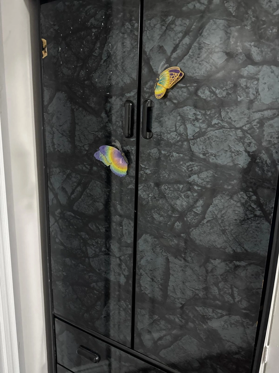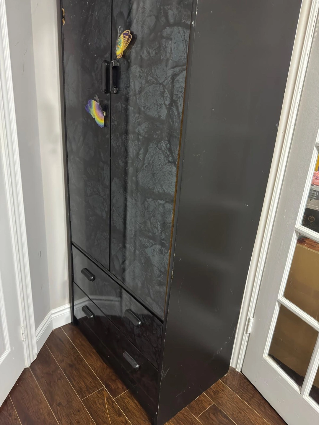 20Selling a black wardrobe. It has a unique marble-like pattern on the doors and some drawers at the bottom for extra storage. It's in good condition and ready for a new home
