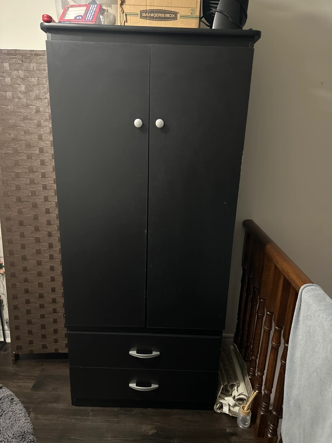 60Selling a black wardrobe that has two drawers at the bottom. It's in good condition and ready for a new home!