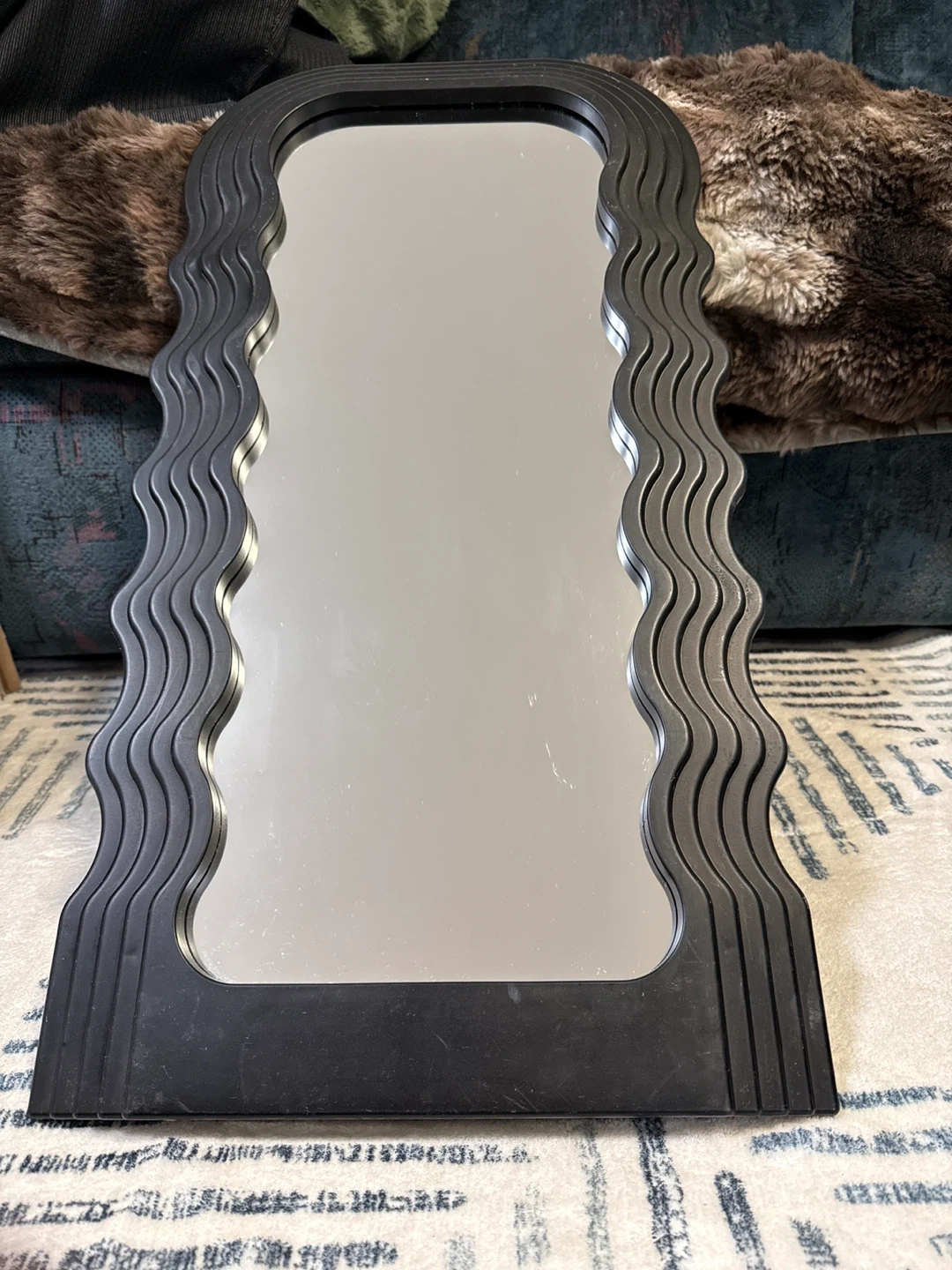 55Here's a cool black framed mirror with a wavy design! It's perfect for adding a unique touch to any room. It's in great condition and ready for a new home. It’s light weight makes it easy to carry.
