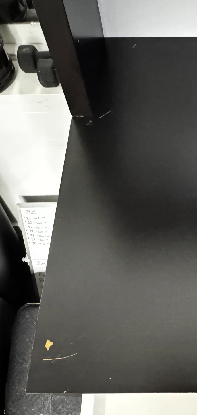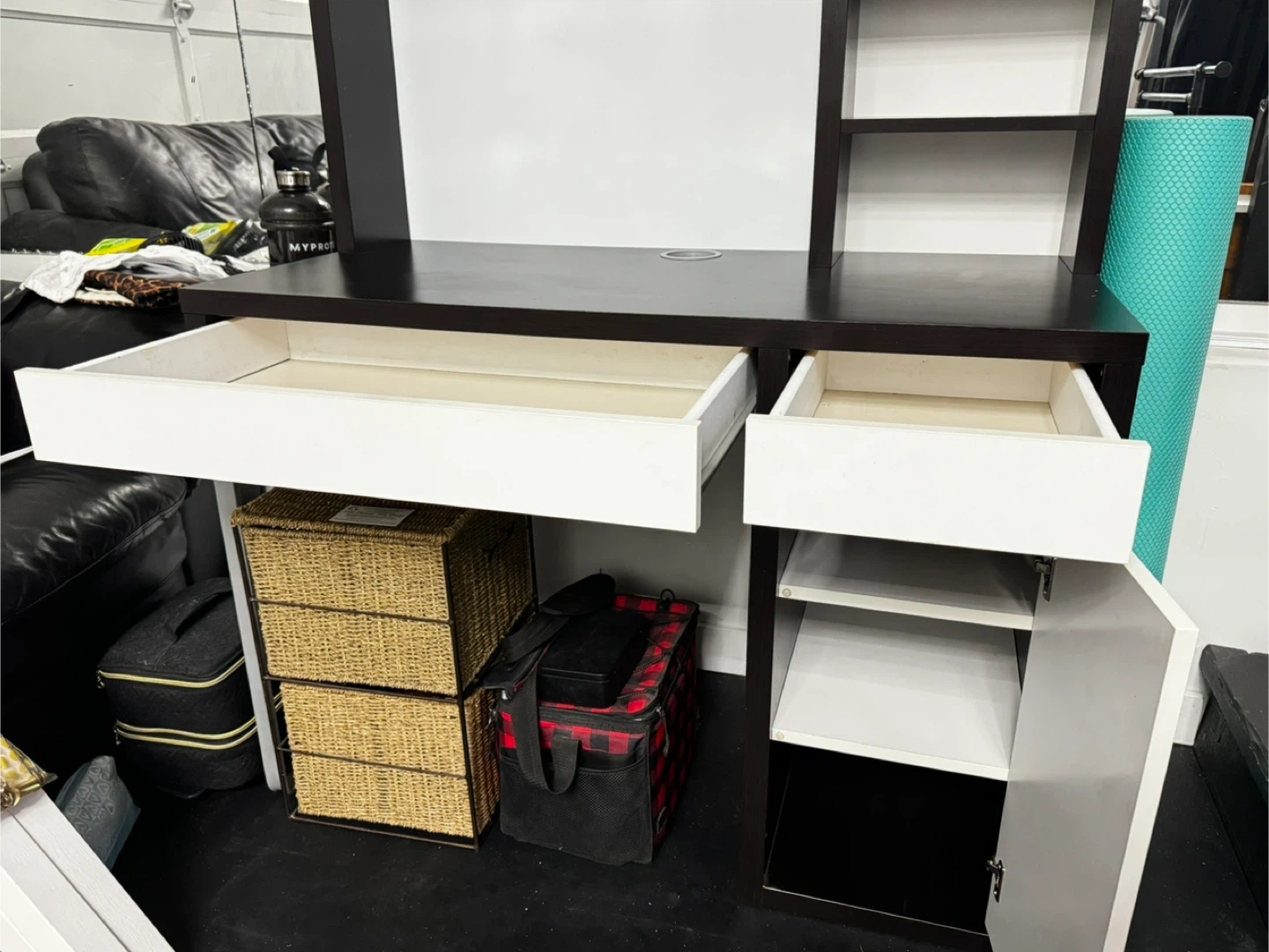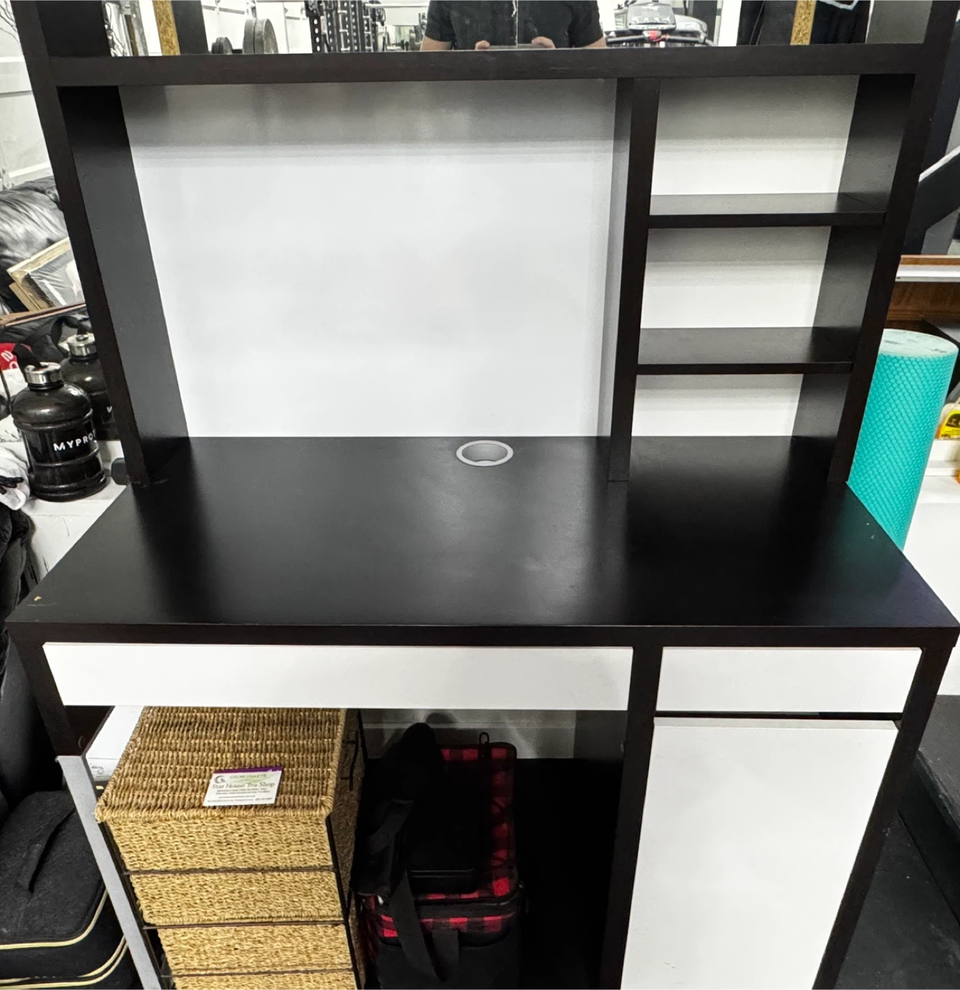 99Here's a computer desk with storage shelves, drawers cabinets and a built in white board. Perfect for a home office or study space. It features a black top and white drawers/cabinet, offering a stylish contrast. There are some signs of use, like scratches, but it's still a functional desk - please see pictures for the scratches