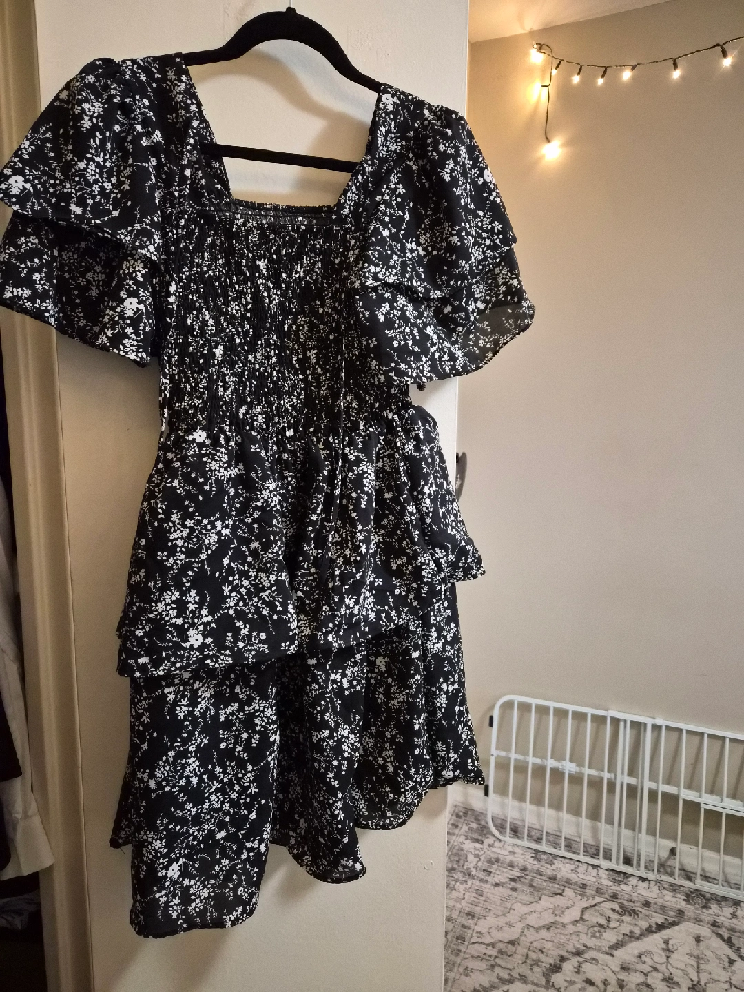 Selling a cute black and white floral mini dress! It features a square neckline, short ruffle sleeves, and a tiered ruffle skirt. Very stretchy!