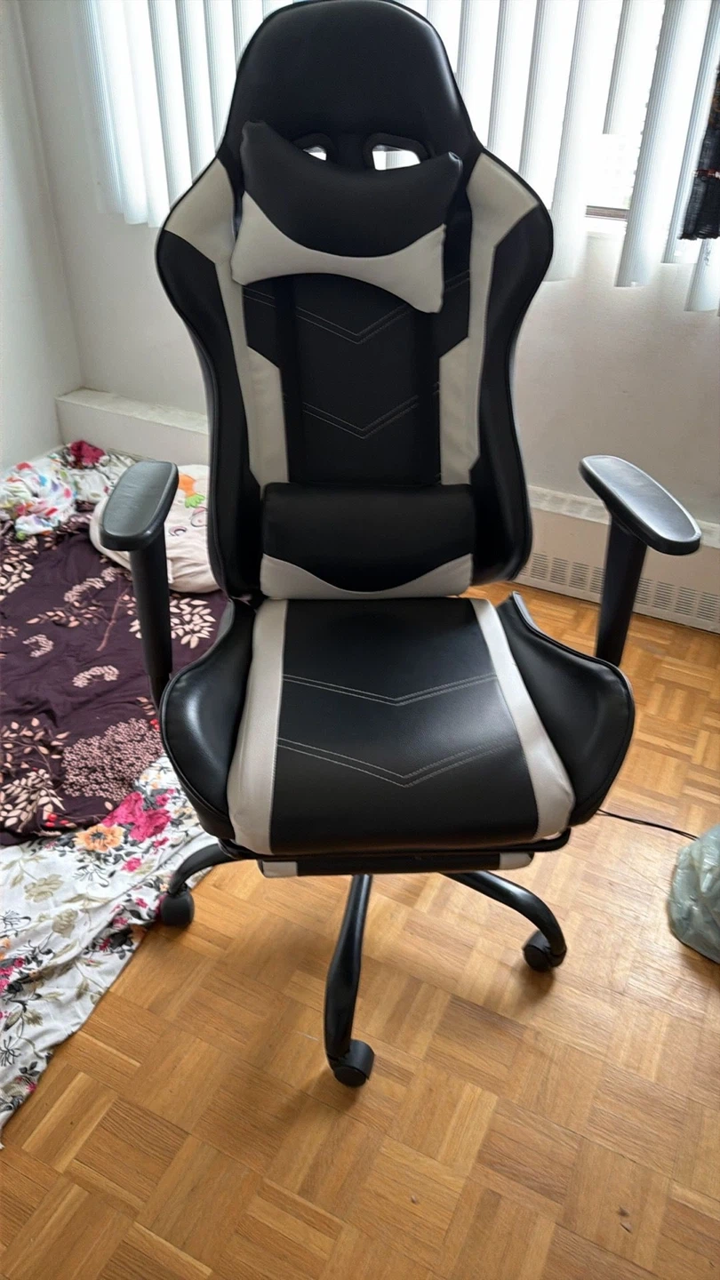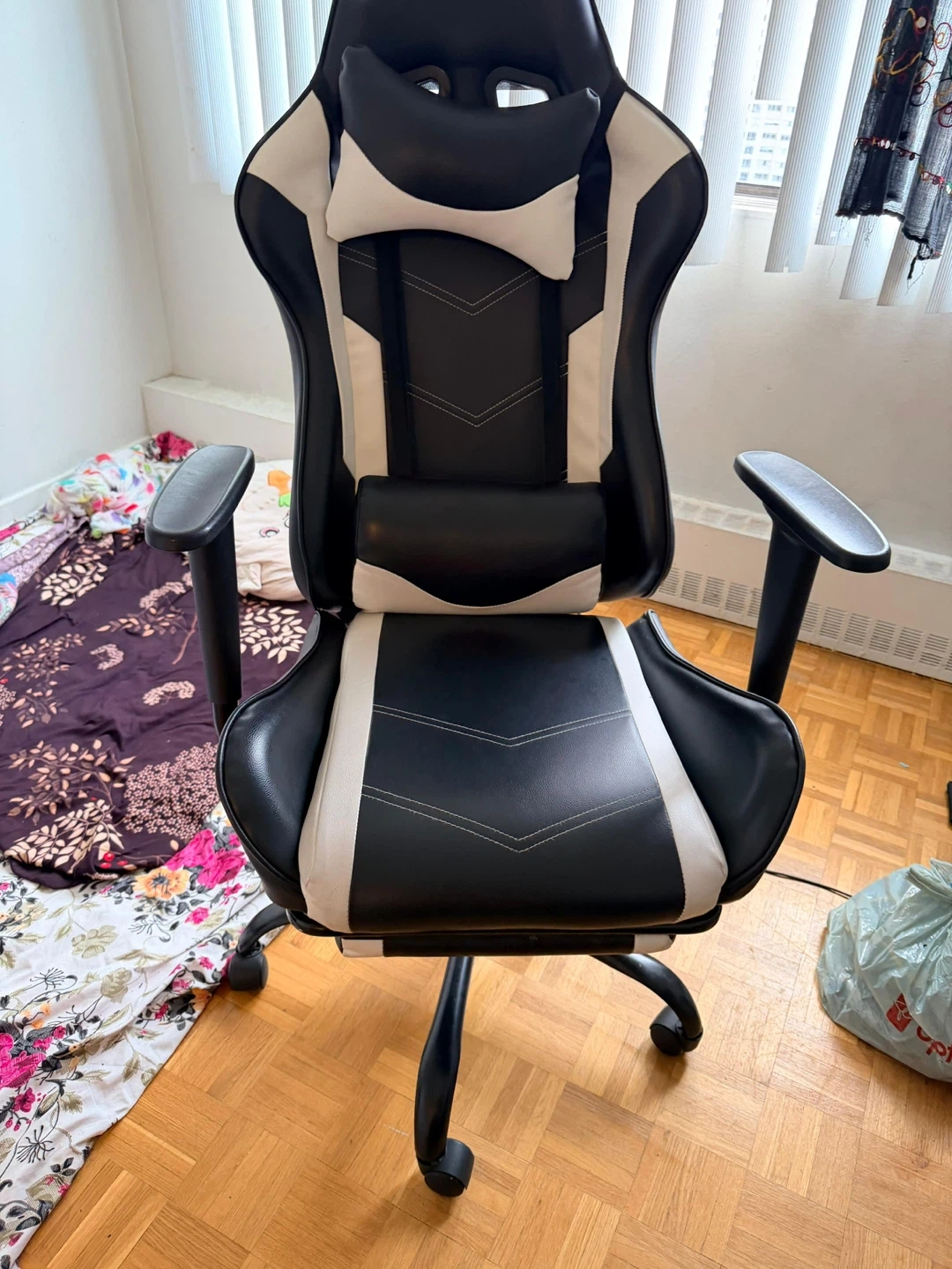 Selling a gaming chair in black and white. It's in great shape and ready for a new home. Perfect for long gaming sessions or working from home. It has a headrest and lumbar support for extra comfort!