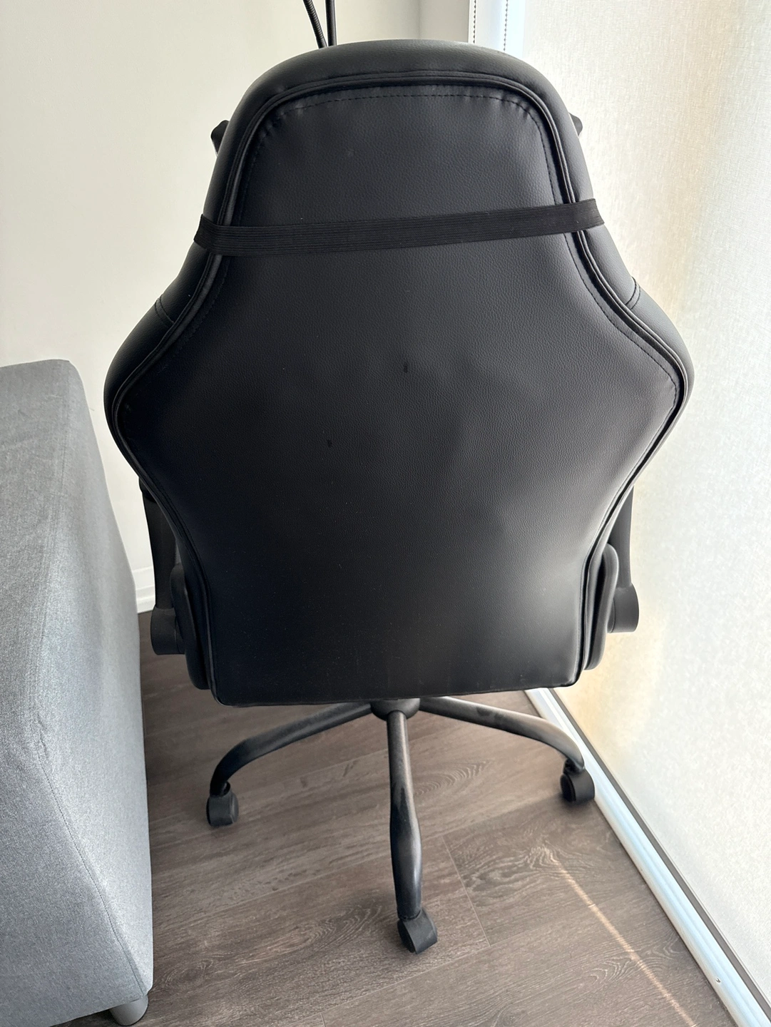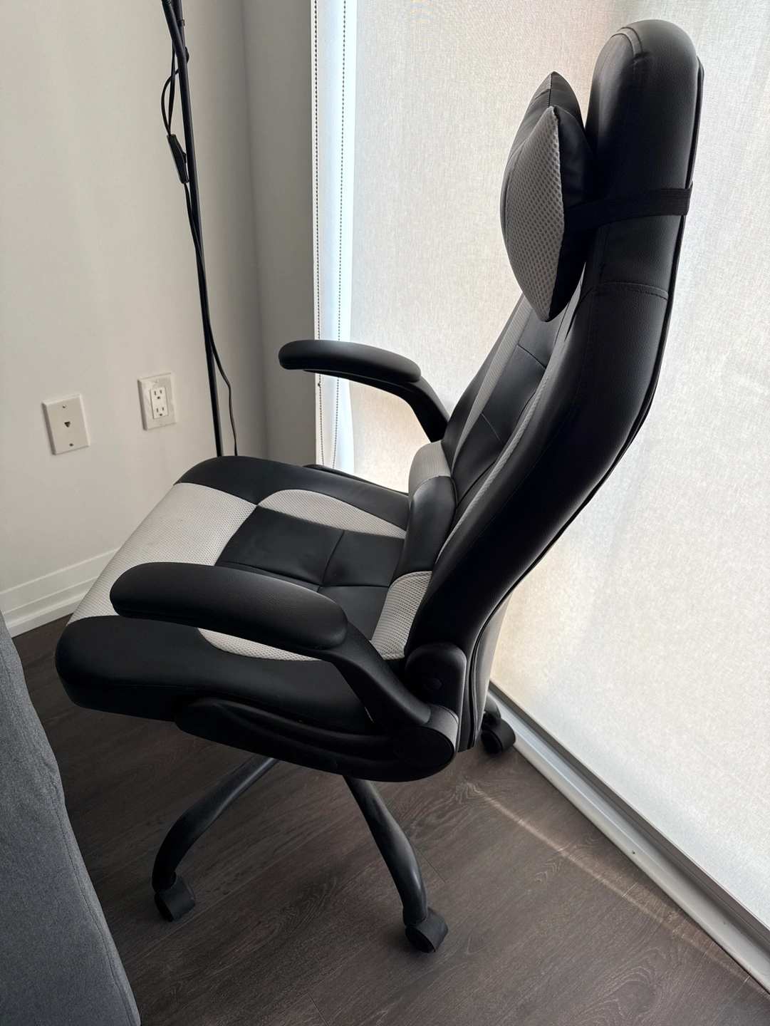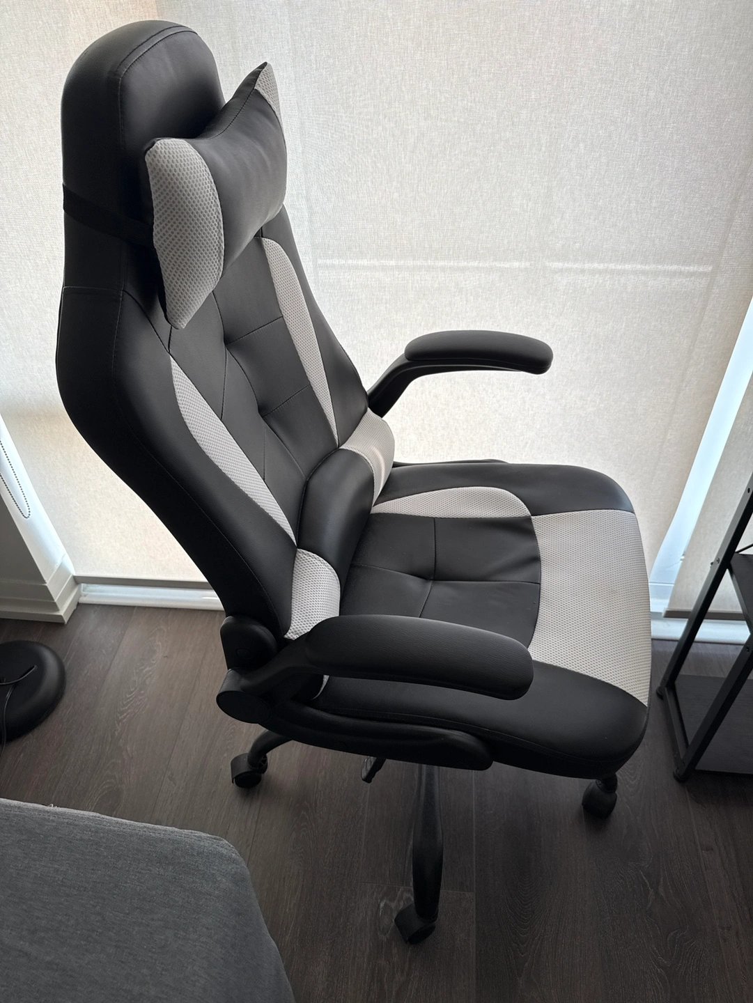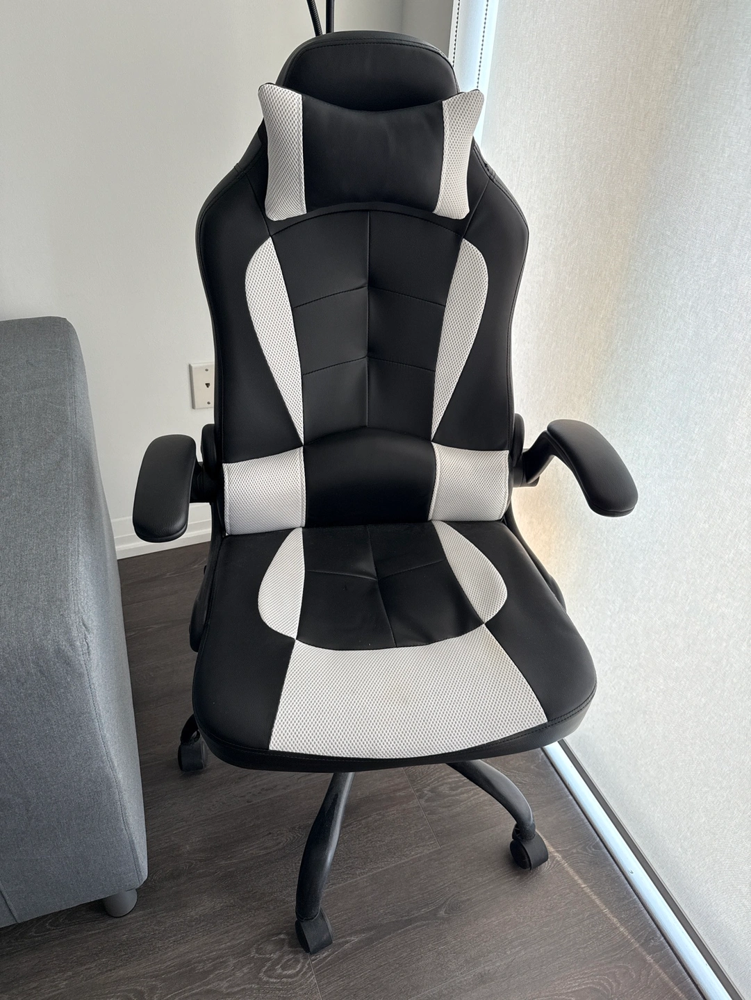62Selling a comfy gaming chair in black and white! It's perfect for long gaming sessions or working from home. It has good back support and adjustable armrests for extra comfort. The chair is in great condition and ready for a new home