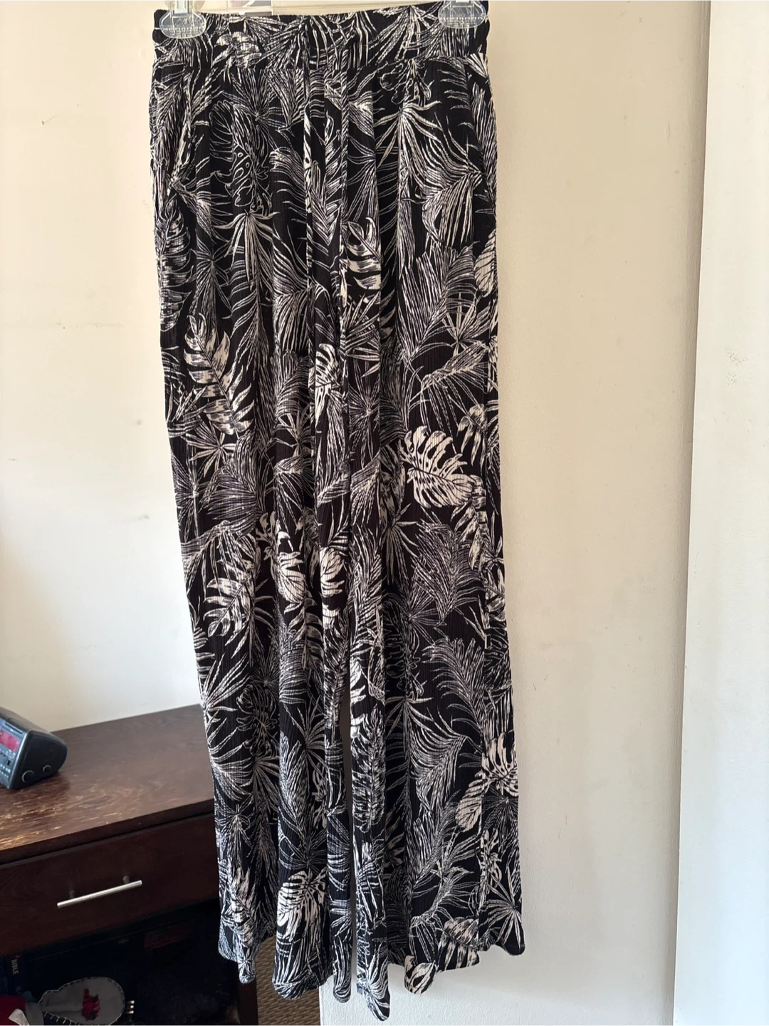 65Selling these comfy wide-leg pants with a black and white leaf print and an elastic waist.They're perfect for lounging around the house or wearing out on a warm day. The material is lightweight and breezy!