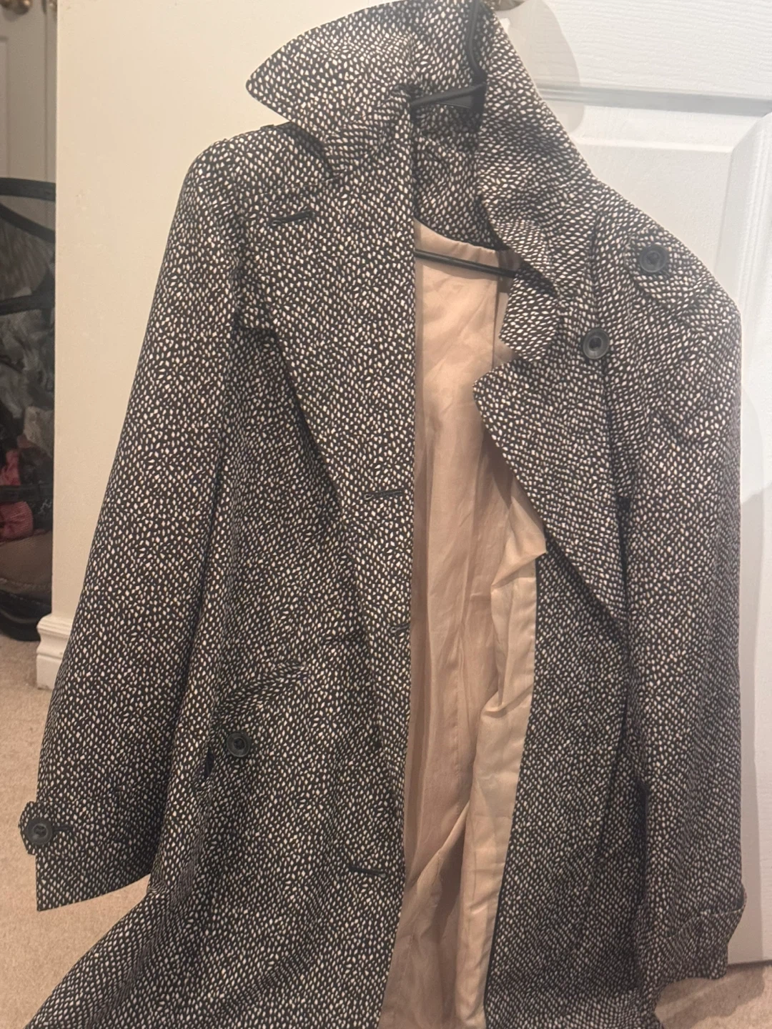 Selling a stylish black and white patterned coat. It's in great condition and ready for a new home!