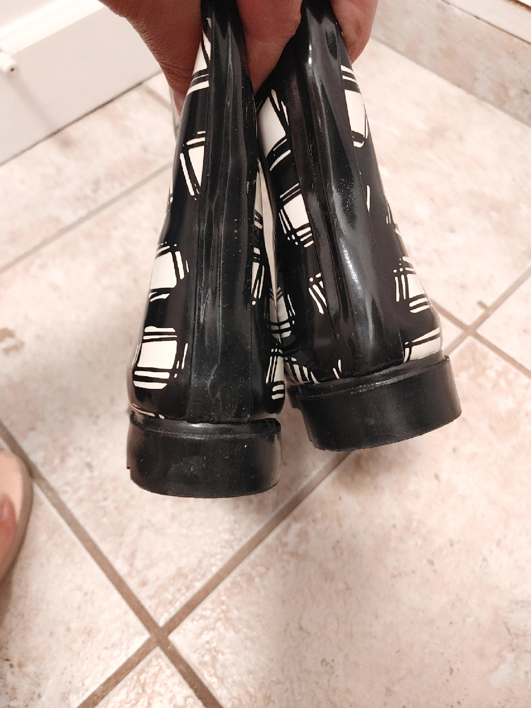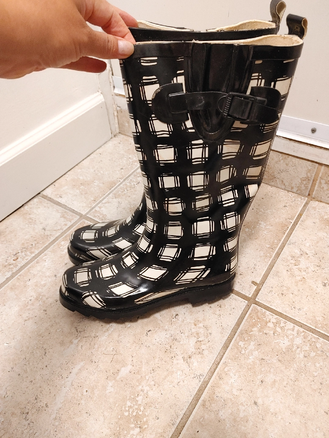 Here are some rain boots with a black and white plaid pattern. They're in good condition and ready to keep your feet dry on those rainy days!