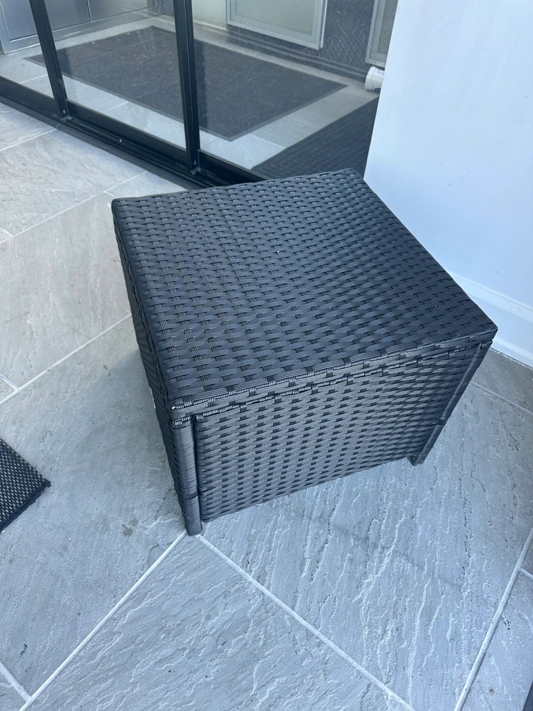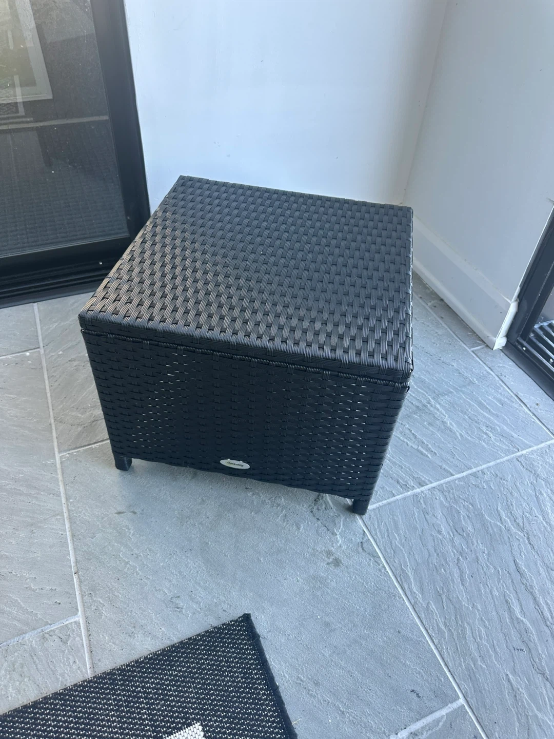 This black wicker patio side table is perfect for adding a touch of style and functionality to your outdoor space. It's in great condition and ready to be enjoyed on your patio or balcony. Its square design makes it versatile for any space