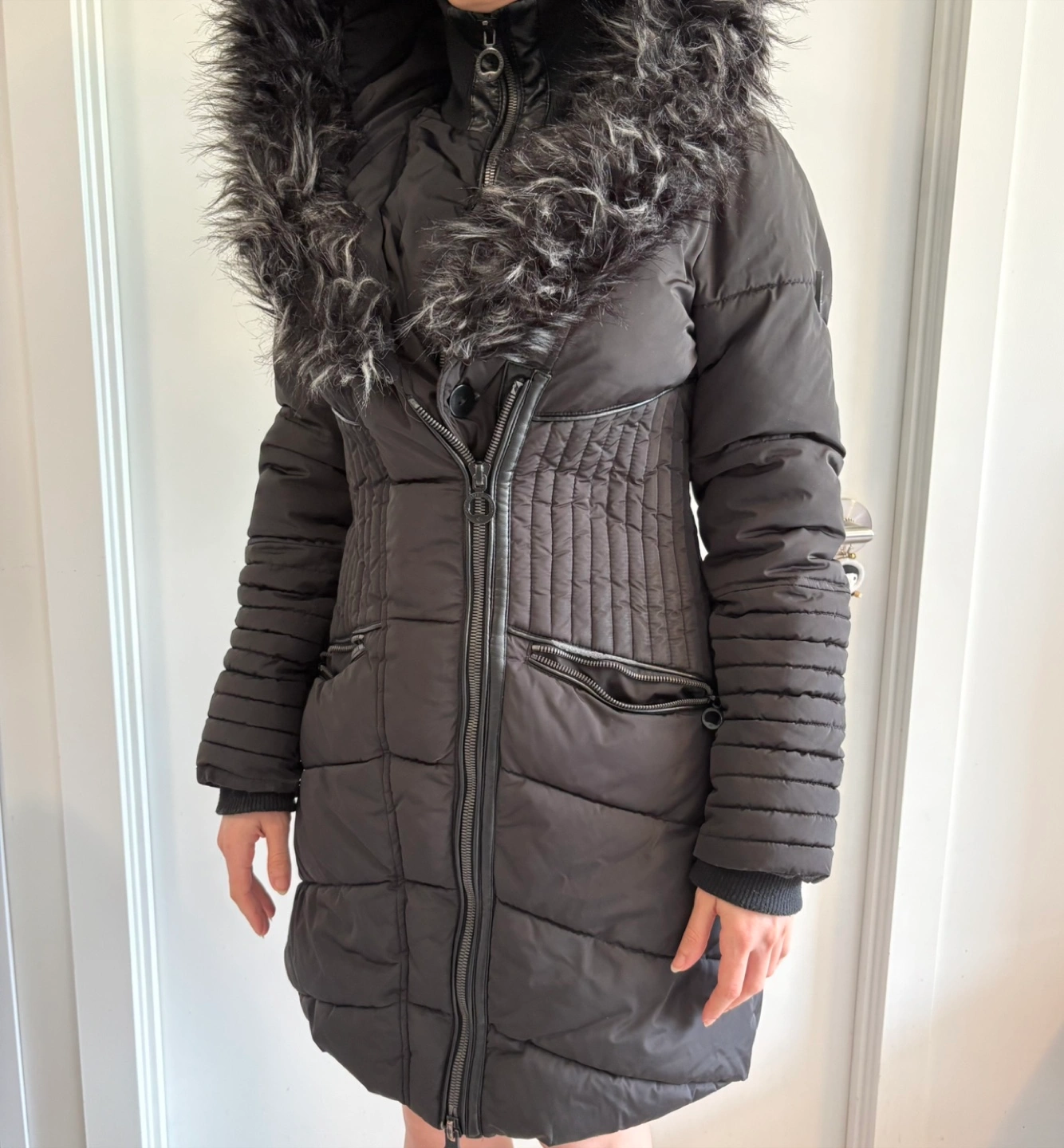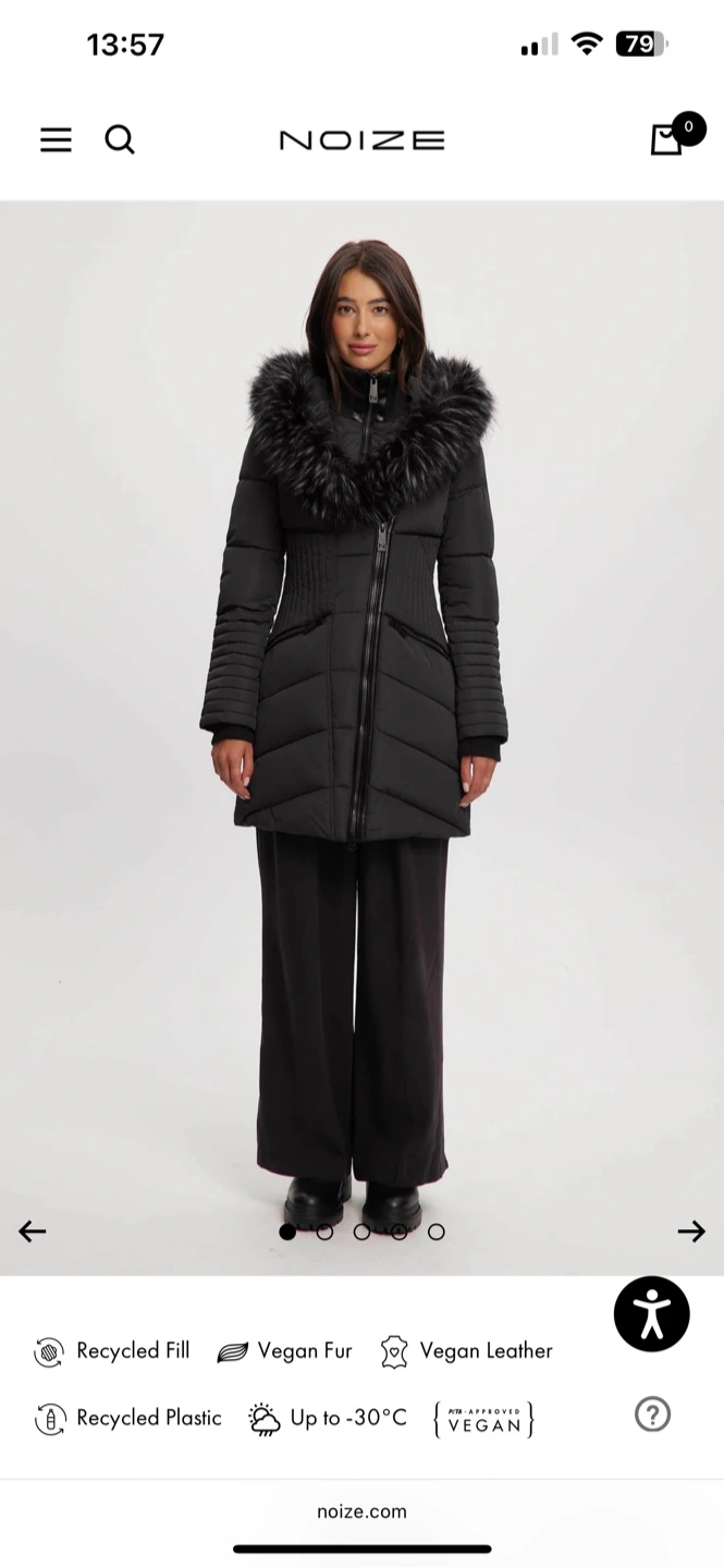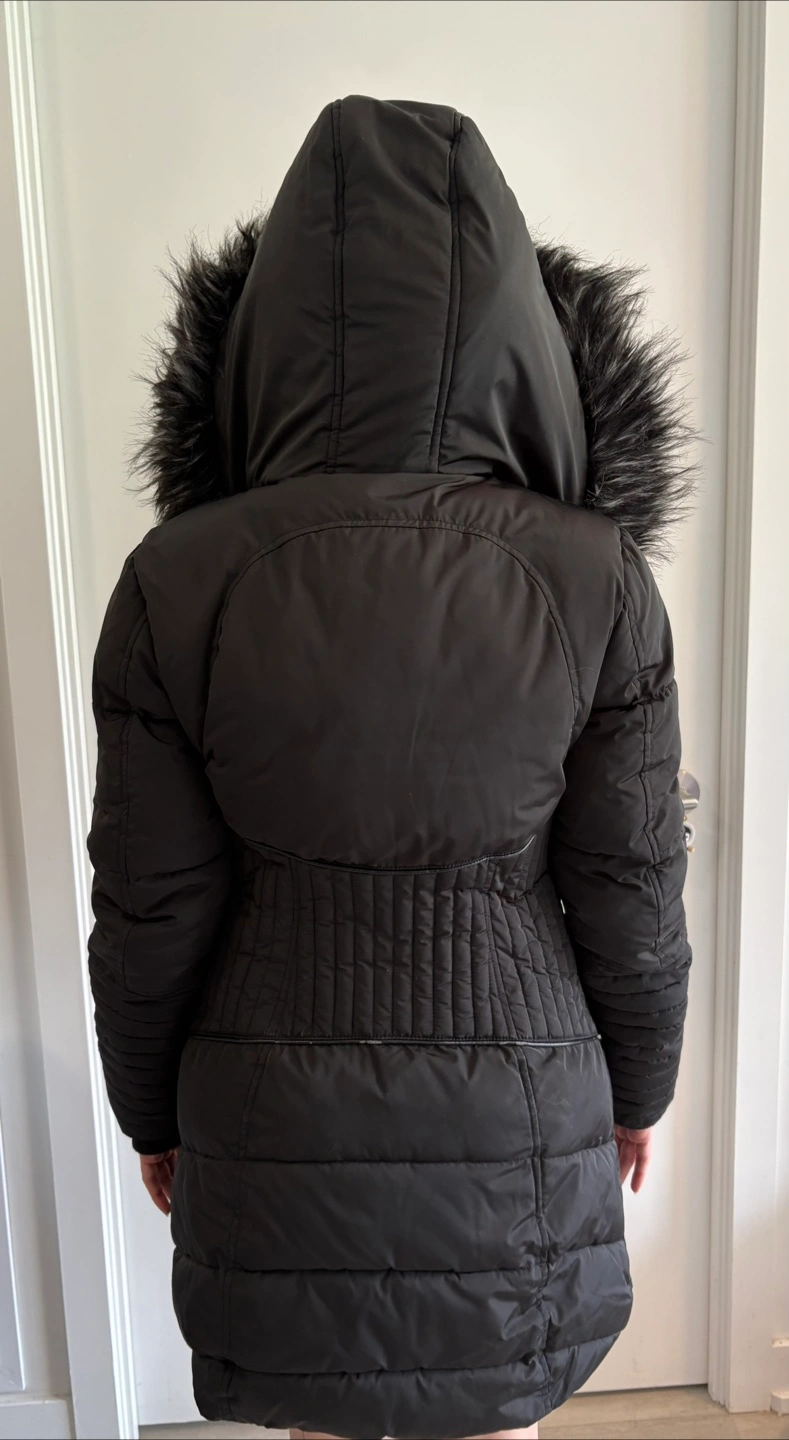 Black winter jacket. Up to -25 to -30. Featuring a hood with fur trim. It has a zipper closure. You could take a walk in this coat and enjoy the crisp winter air. Original Price in the Noize website is 418+HST