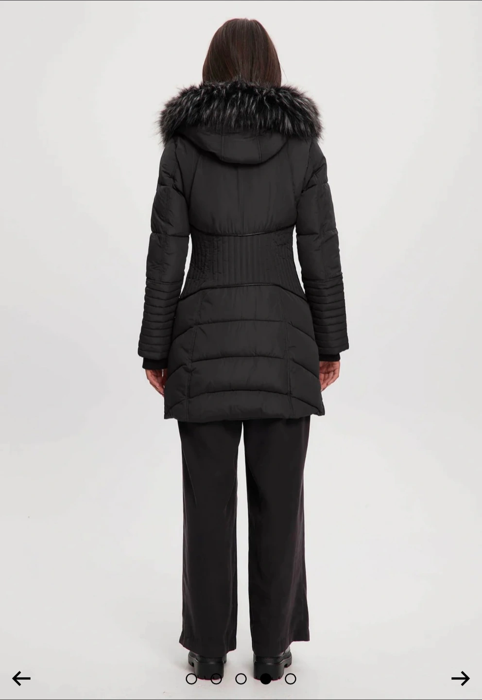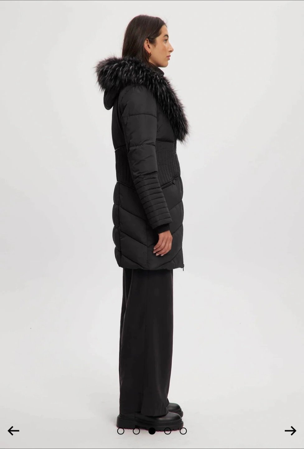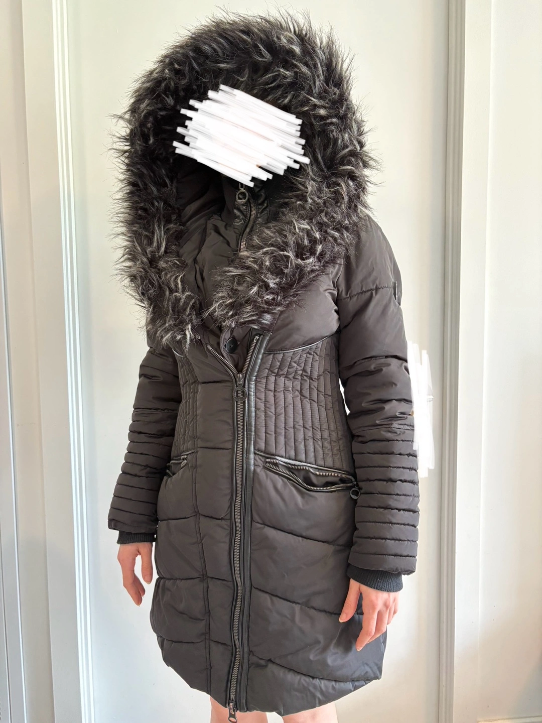 Black winter jacket. Up to -25 to -30. Featuring a hood with fur trim. It has a zipper closure. You could take a walk in this coat and enjoy the crisp winter air. Original Price in the Noize website is 418+HST