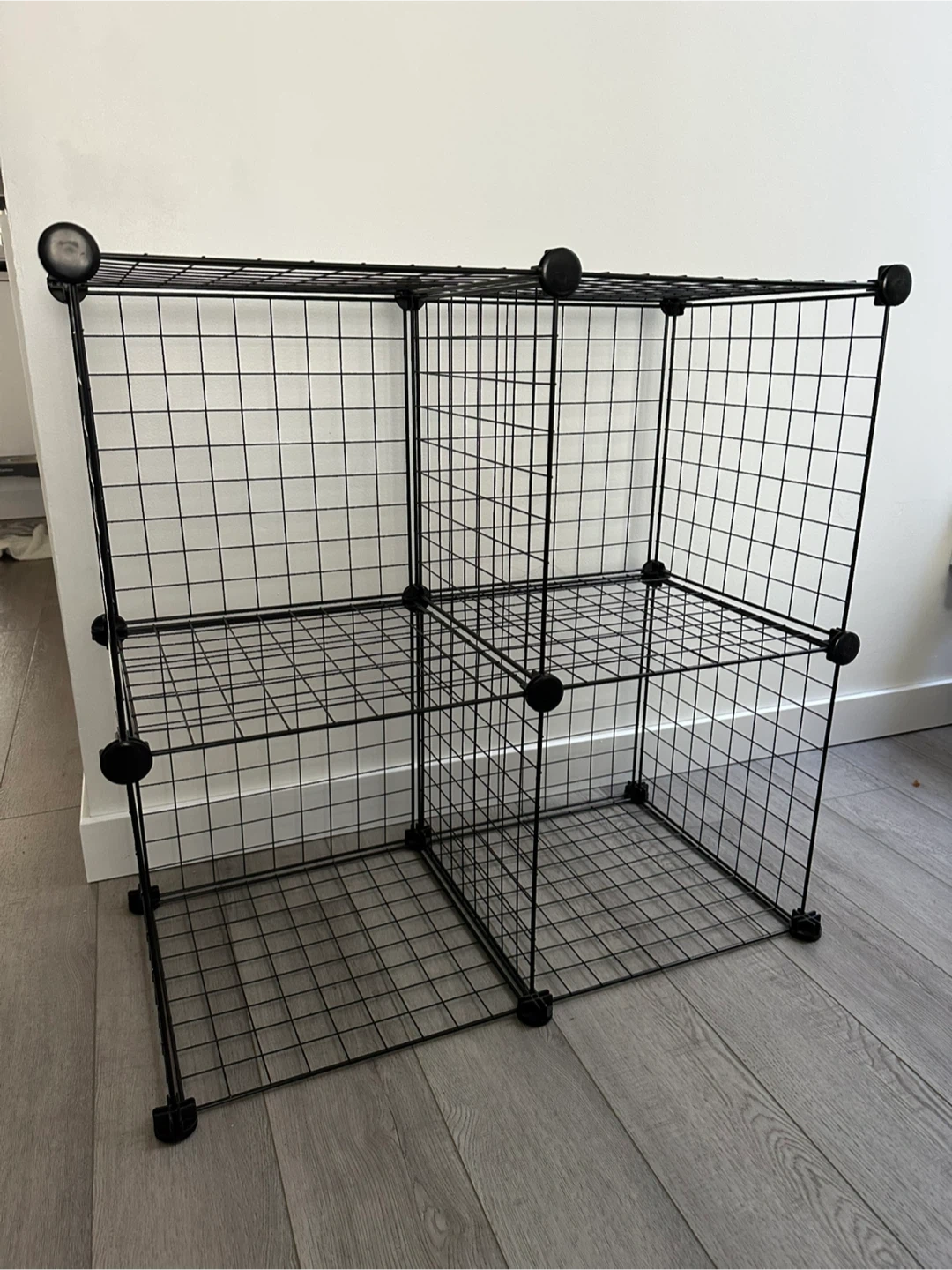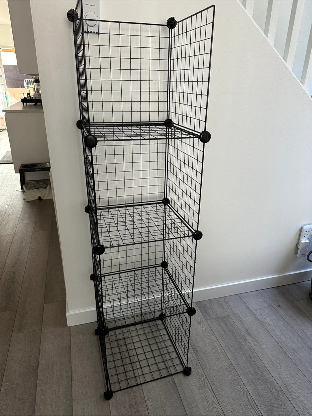Free black wire cube shelf organizer! It's in great condition and perfect for adding some extra storage space. This modular shelving unit is easy to assemble and customize to fit your needs. Great for organizing books, clothes, or anything else you need to store. Each