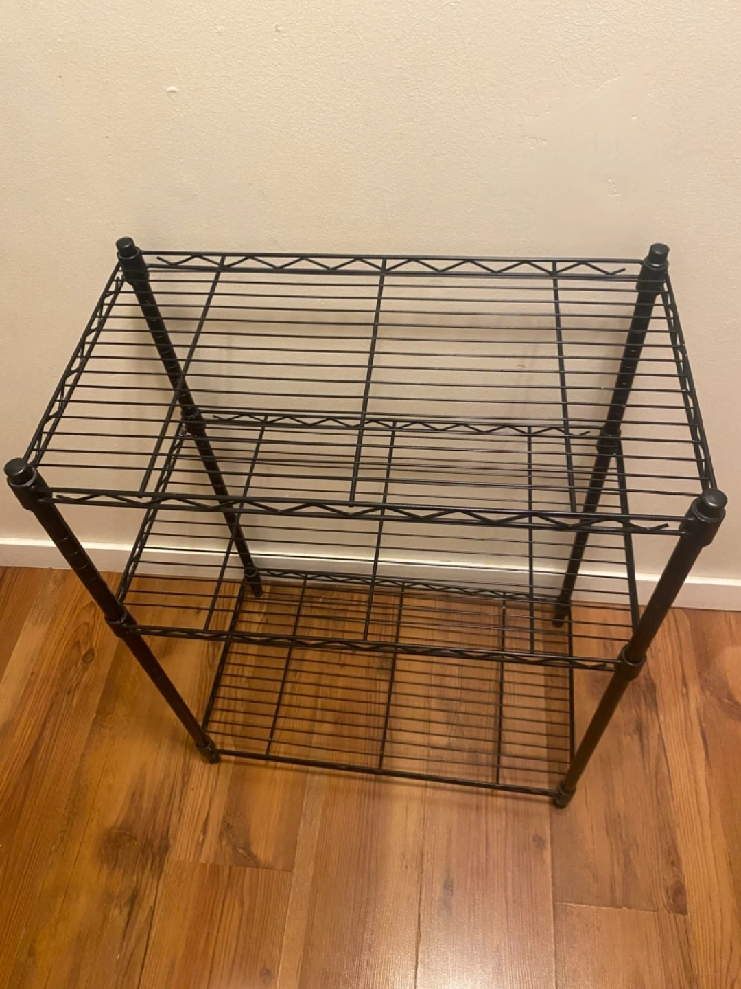 24Selling a handy black wire shelf rack! It's perfect for adding some extra storage to any room. Great for organizing shoes, pantry items, or anything else you need to keep tidy. It’s a good condition but one part of wire is coming off.