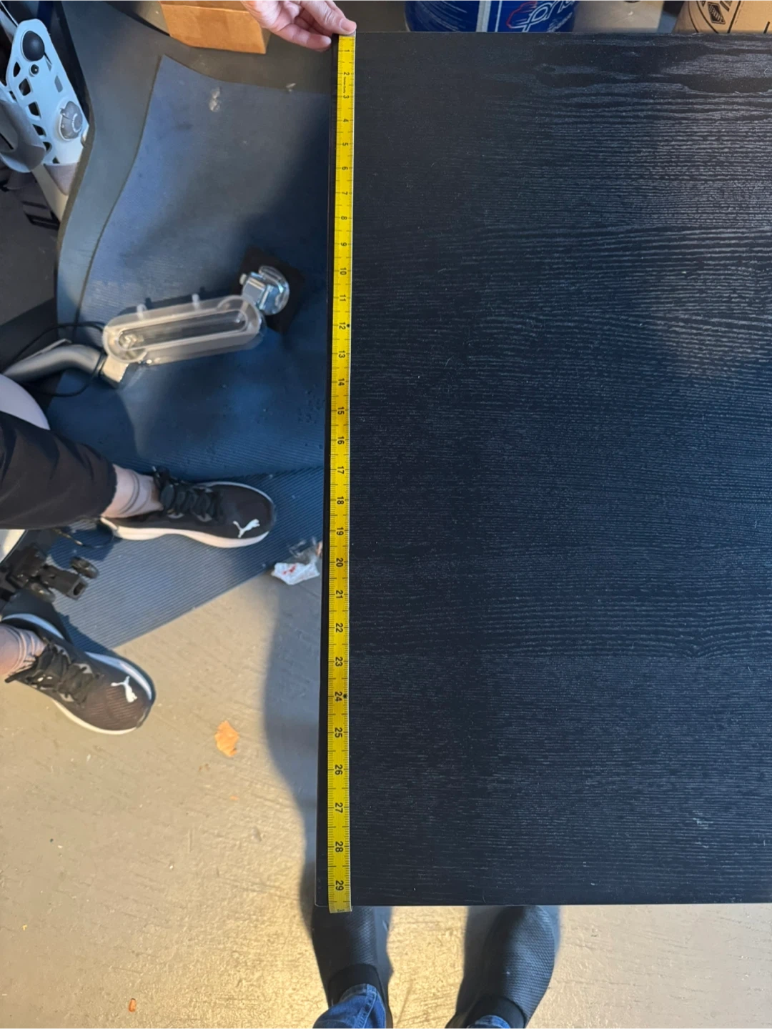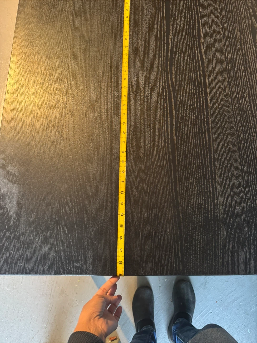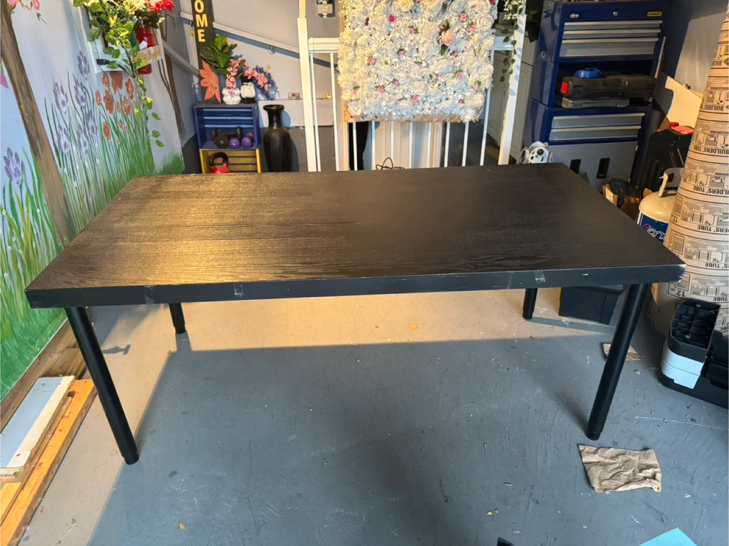 5Selling a desk with a black wood grain finish. It measures approximately 58 inches in length and 29 inches in width. It's a sturdy and functional piece, perfect for a home office or study area