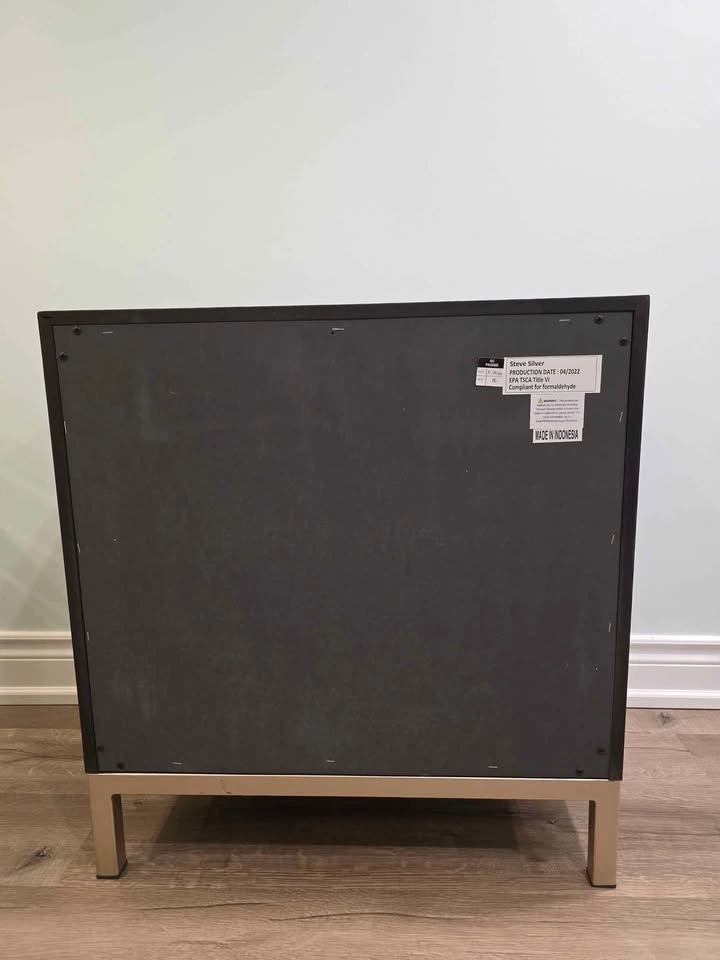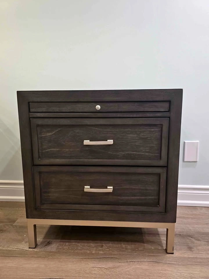 2-drawer nightstand, featuring a sleek walnut finish, metal base, and smooth drawer handles. Retailing for $609.99 – $720+ tax, this high-end piece is available at a fraction of the price due to a small cosmetic defect on the side panel (see photo). Brand new from liquidation pallet – never used. 2 spacious drawers + 1 hidden top pull-out tray. Solid and stable with modern brushed metal legs. Dimensions: 28” W x 28” H x 17” D. Comparable retail price: $609 – $720