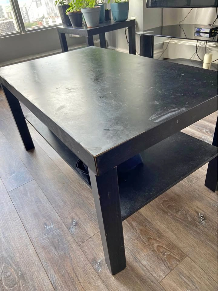For sale: Black wooden coffee table with a lower shelf for extra storage. Simple, sturdy, and functional โ perfect for living room or office use. Some signs of use but overall in good condition. Pickup only! It is available after 16th September.