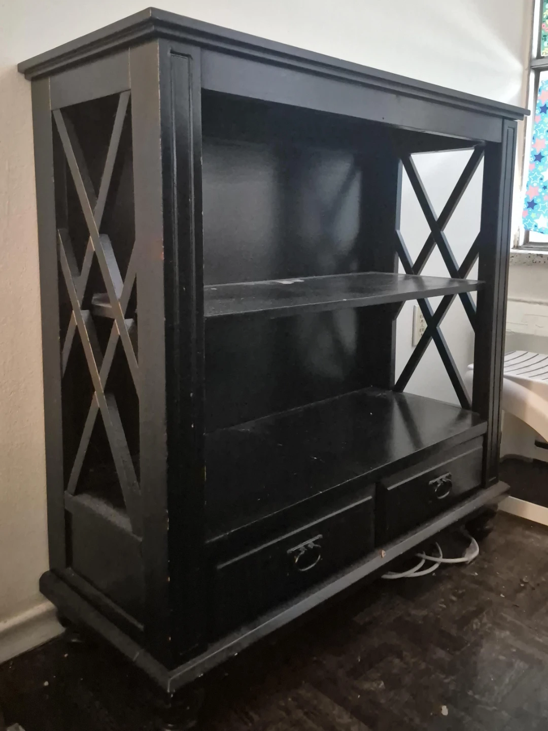 22Selling a black wooden console / bookshelf. It has a classic design with X-shaped accents on the sides. There are two shelves and two drawers for storage. It's in good condition and ready for a new home!