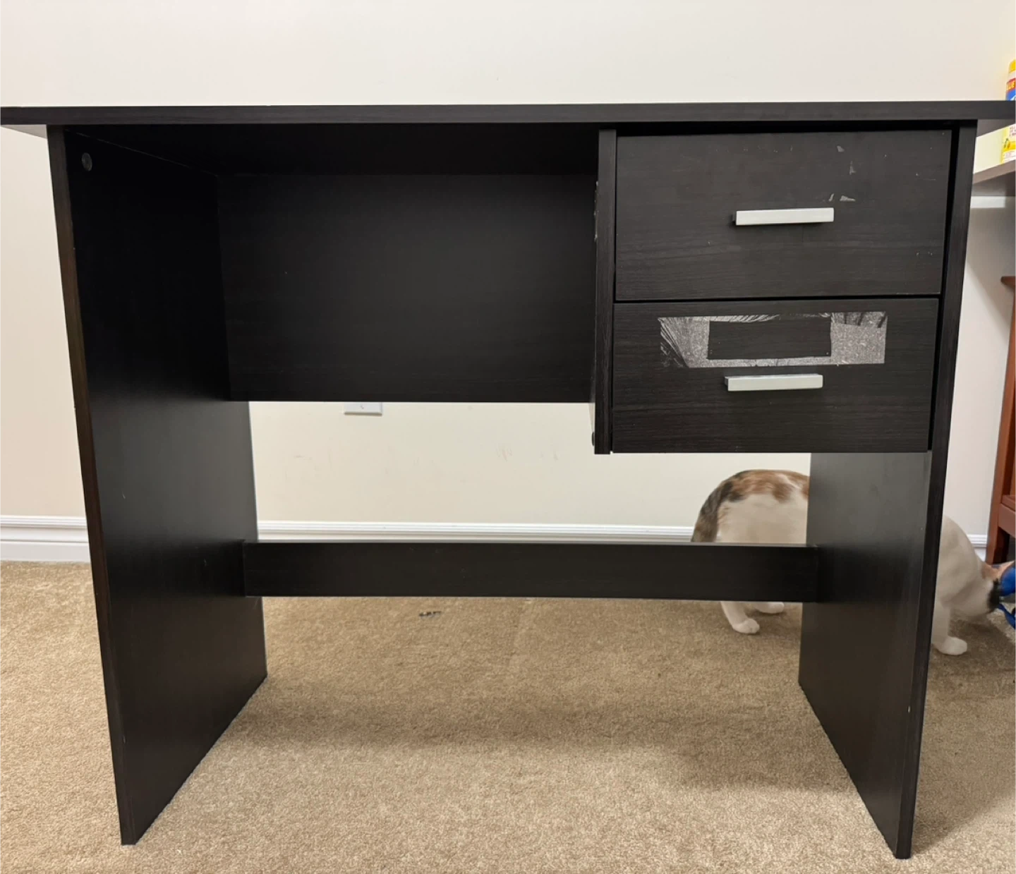 10Selling a black wooden desk that's perfect for a home office or study space! It features a clean design with a couple of drawers for storage. There are some signs of use, but it's still in good condition and ready to be used.