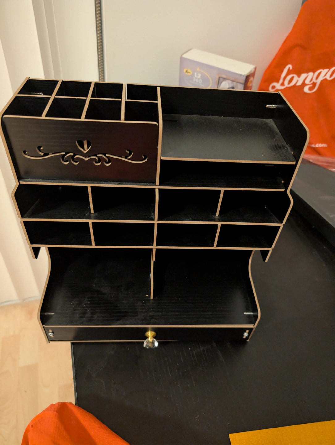 Looking to declutter your space? I'm selling this handy black wooden organizer! It features multiple compartments and a small drawer with a crystal-style knob.