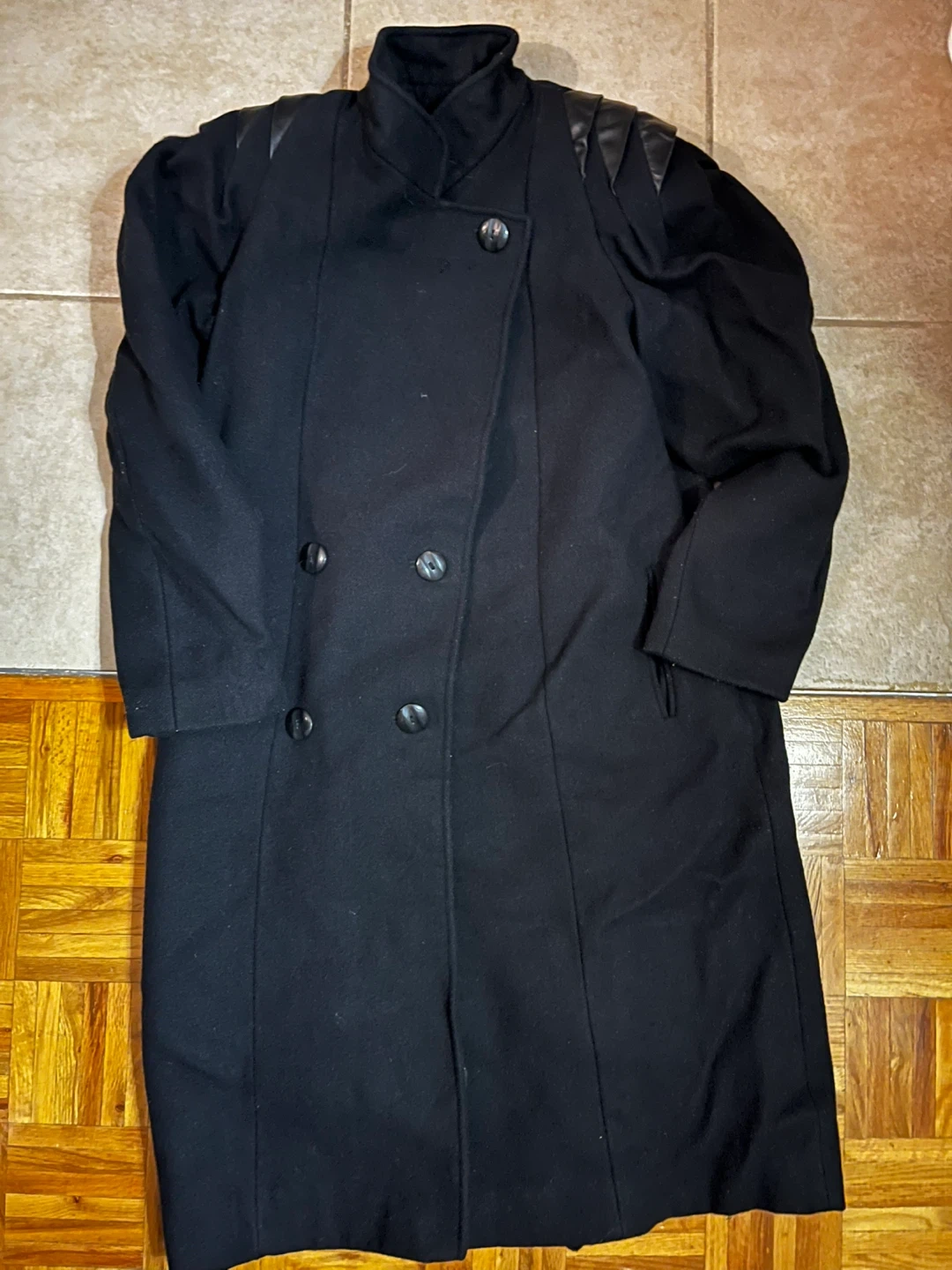 🖤stylish black coat, perfect for cooler weather! 🖤It has a classic double-breasted design and features leather-look detailing on the shoulders. 🖤Fits S to M, has a wide shoulders design Pick up only Cash only