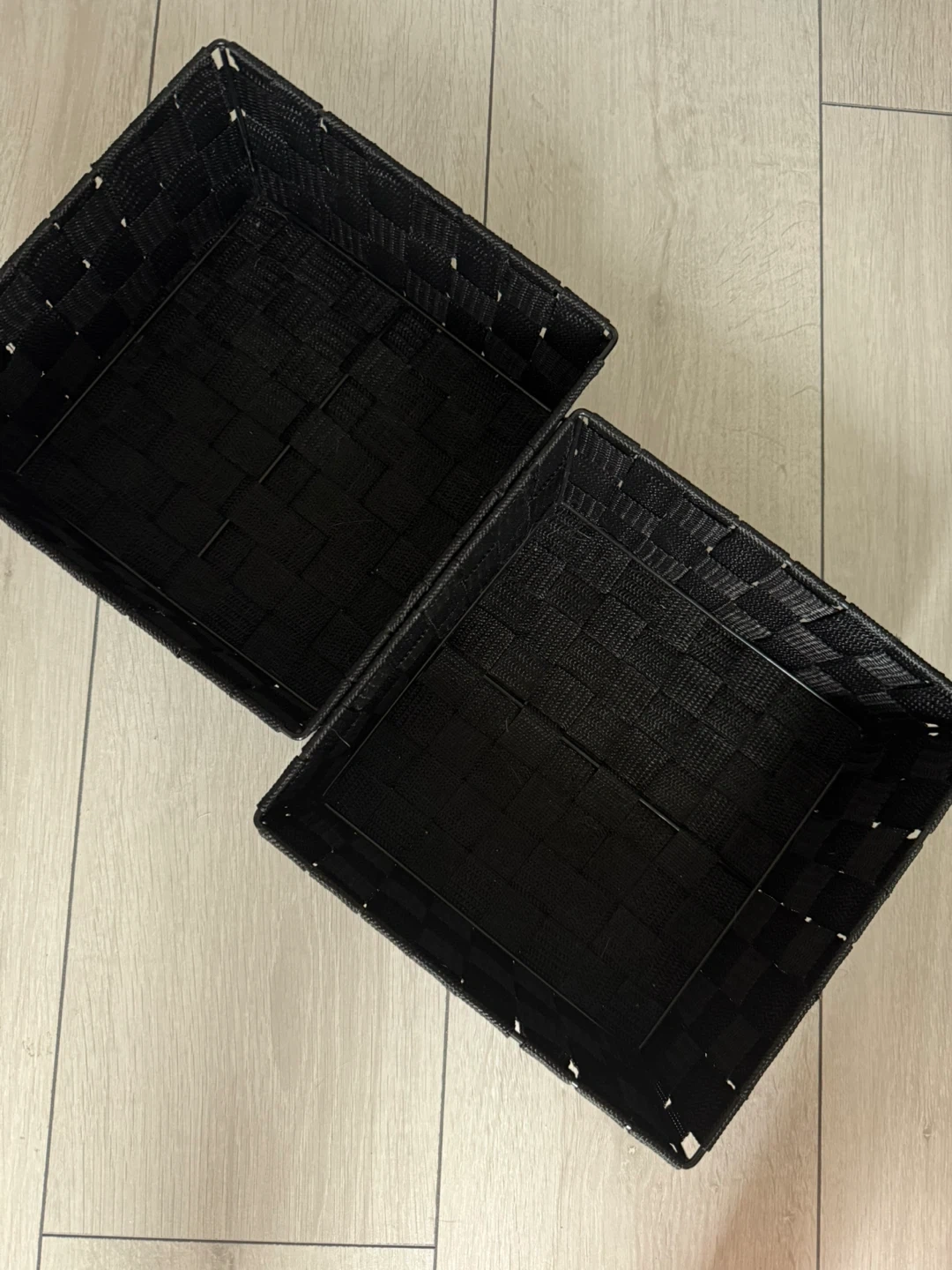 10Selling a set of two black woven storage baskets. They're in great shape and perfect for organizing your space!