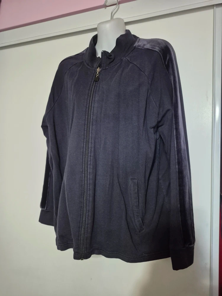 18A comfy black zip-up jacket that's perfect for layering! It features a full zipper and handy pockets. The material looks like a soft cotton blend, great for everyday wear