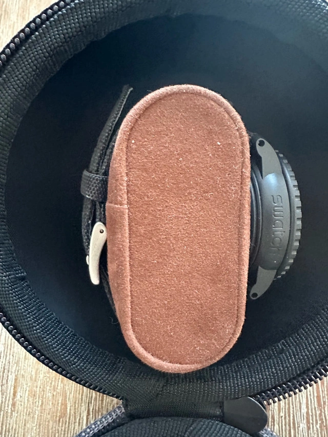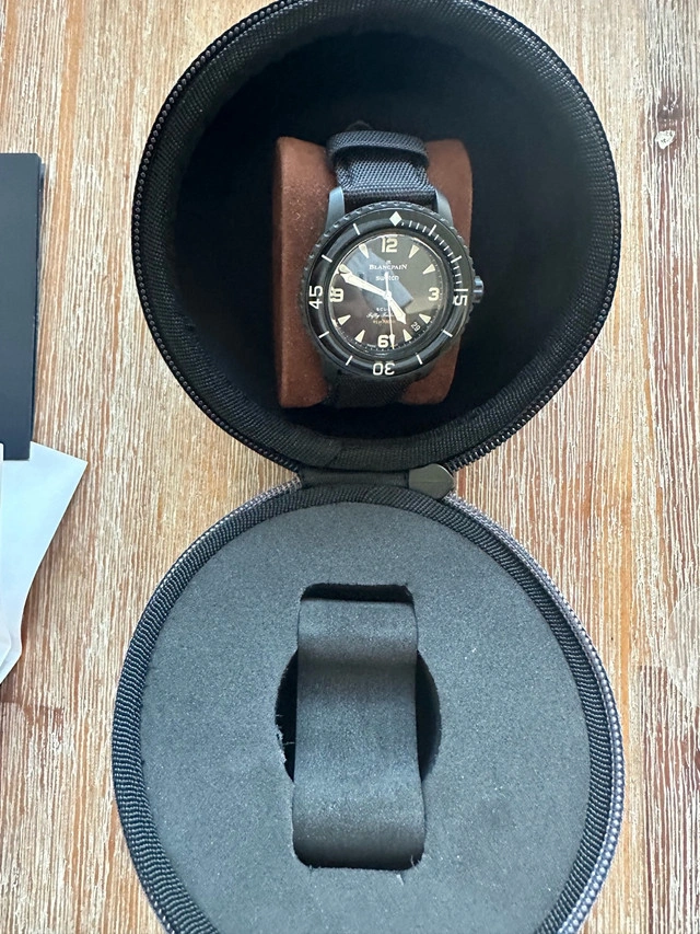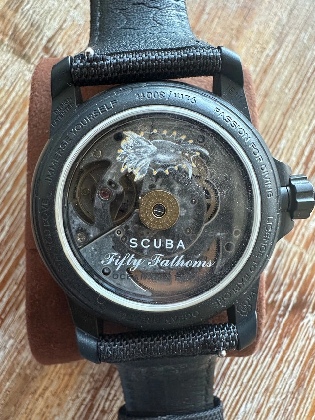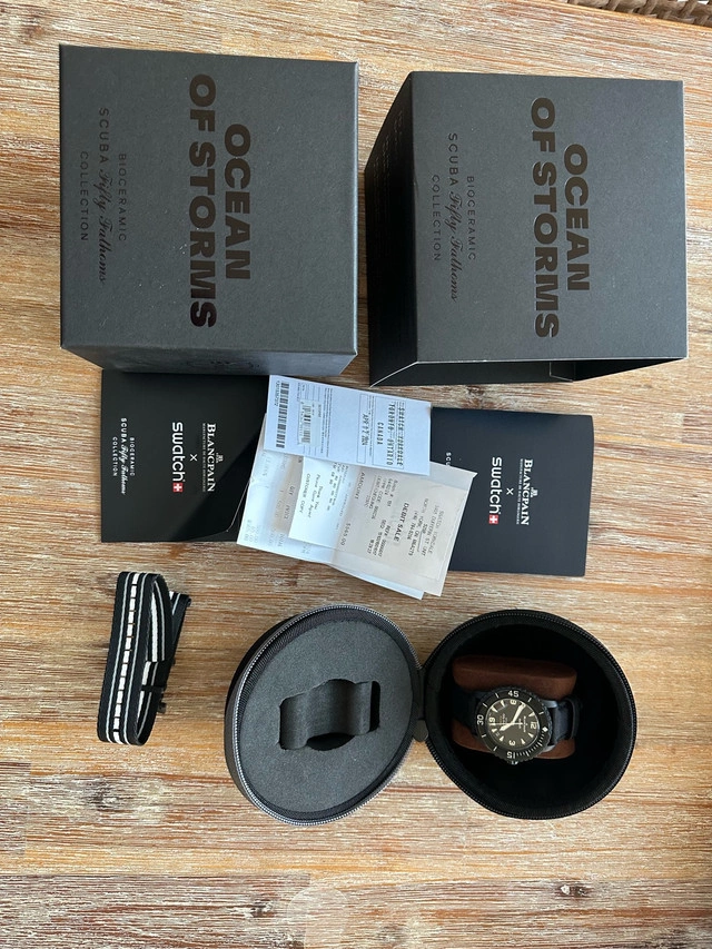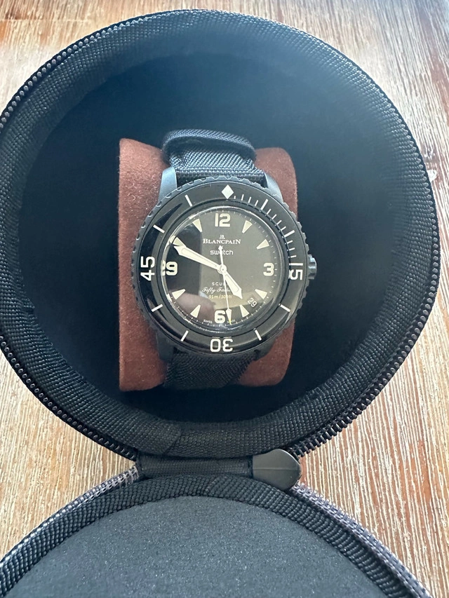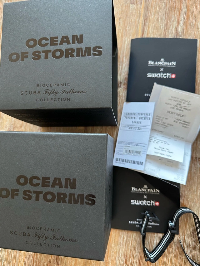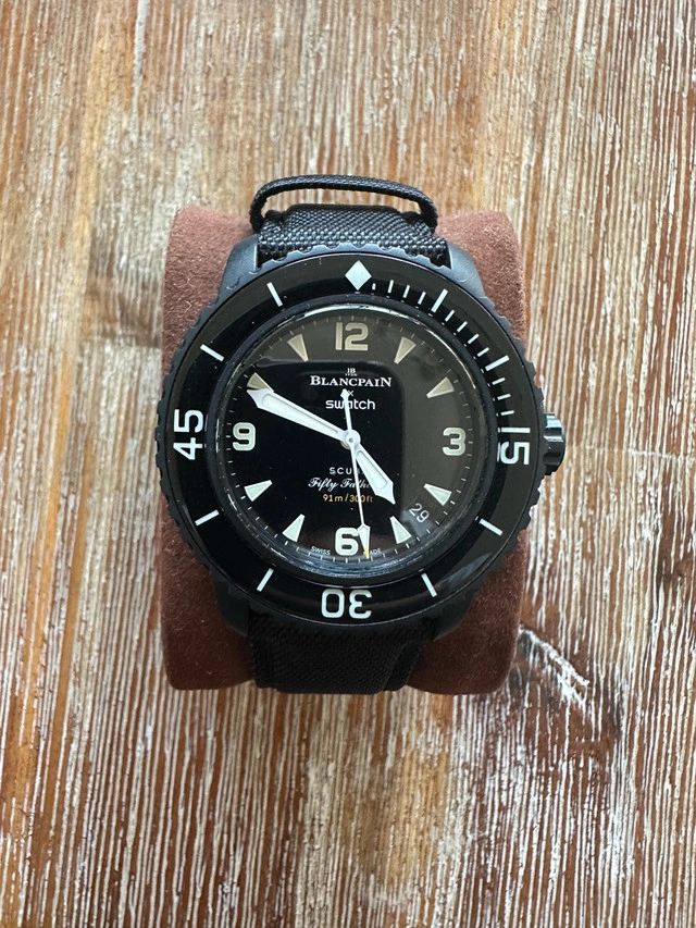 This Blancpain X Swatch watch honors Blancpain’s Fifty Fathoms, the first true diver’s watch. Its black case and crown are made of Bioceramic material. The word “Swatch” is inscribed on the outer left side of the case. The dial has a black sunbrushed finish and features a date indicator between 4 and 5 o'clock. The hour indexes, hour, and minute hands, as well as the scale on the bezel, are enriched with Grade A Super-LumiNova® for outstanding legibility in the dark. The watch features a black unidirectional Bioceramic bezel and biosourced glass. The SISTEM51 mechanical movement is visible thanks to a transparent sapphire glass and features an illustration of the Oceanus Procellarum (Ocean of Storms) region of the moon and the Okenia Luna nudibranch in digital print. Comes with additional sailcloth strap currently on watch and will be included. Original Strap was not used and can be reinstalled to the watch upon pickup if requested. Watch is in Perfect condition Boxes and all paperwork will be included. 100% authentic from the Yorkdale Swatch location Meetups can be done at Fairview, Yorkdale or Eaton’s Centre $450