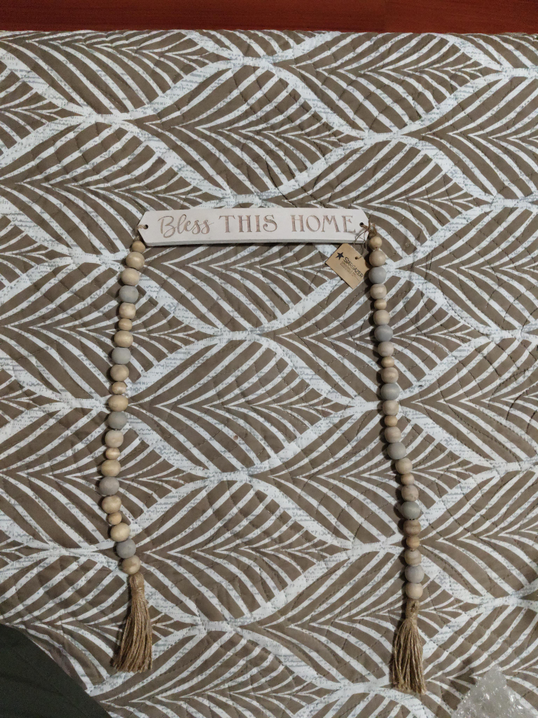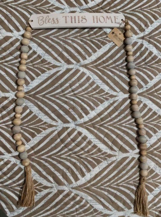 This is a cute wooden bead garland that says 'Bless This Home' on the attached sign. It would be perfect as a decorative accent for your home