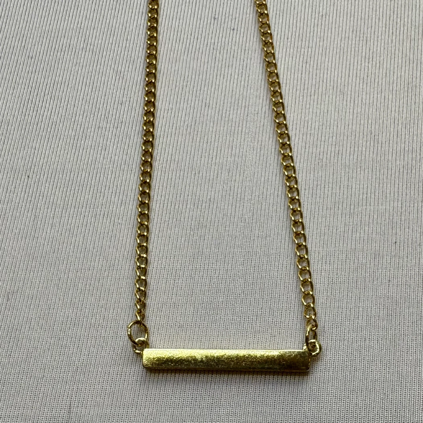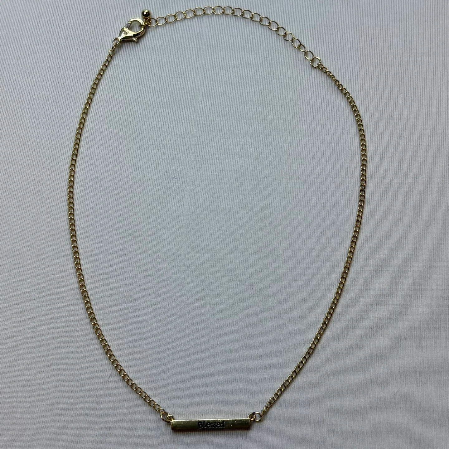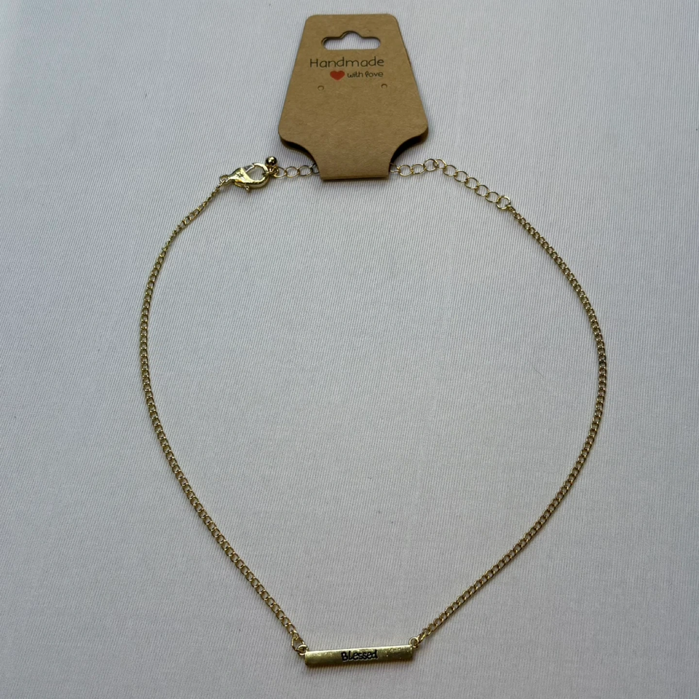 122A beautiful gold-tone bar necklace featuring the engraved word "Blessed" in a script font. This minimalist jewelry piece is designed with a sleek, horizontal bar pendant suspended from a classic cuban link chain. The necklace includes an extension chain and a lobster clasp closure, allowing for adjustable length and versatile wear—perfect as a choker or a shorter pendant necklace. It’s an uplifting and stylish accessory for everyday wear or a meaningful gift for someone special. The necklace is a small-batch creation. Keywords: Blessed, Necklace, Bar, Pendant, GoldTone, Engraved, Minimalist, Dainty, Adjustable, Chain, Choker, Jewelry, Scripture, Inspirational, Gift, Handmade, Simple, Faith New with tags! Brand: Handmade Era: Modern Color: Gold Tone Print: Engraved "Blessed" Material: Alloy Metal (Gold Tone) Condition: New, never worn Size: Adjustable See photos for measurements. Flaws: None noted Cross posted. Winnipeg - Pick up only (Located 2 blocks west of Polo Park). Shipping options available through other platforms message me for details.