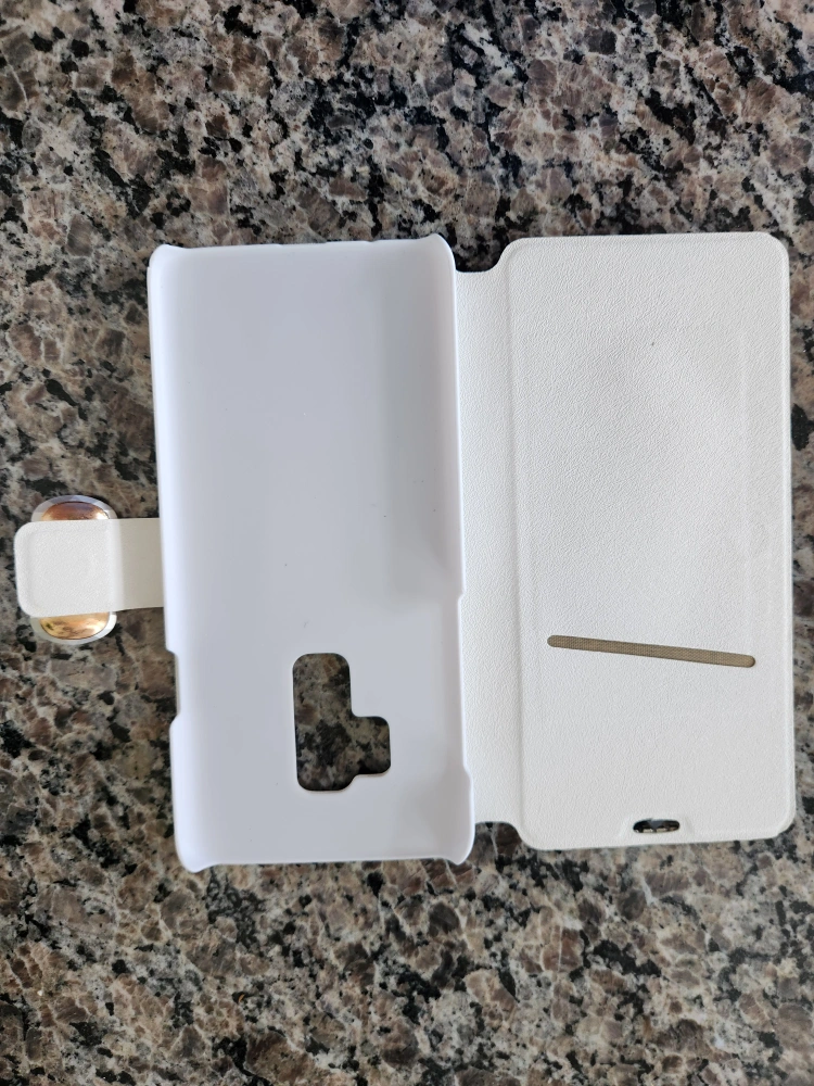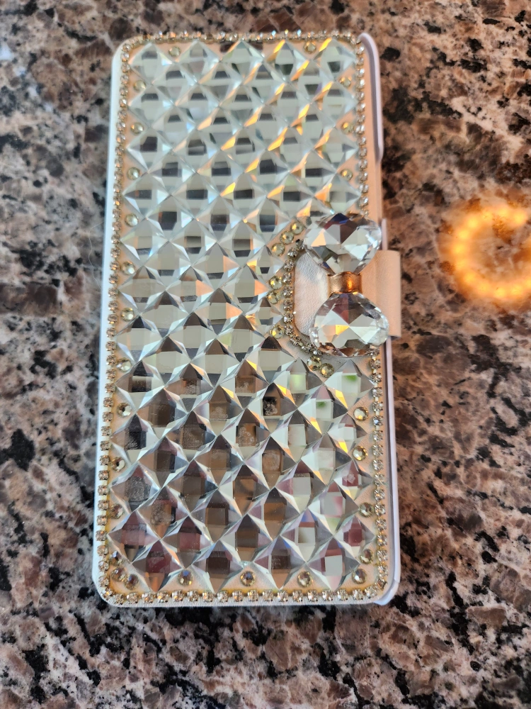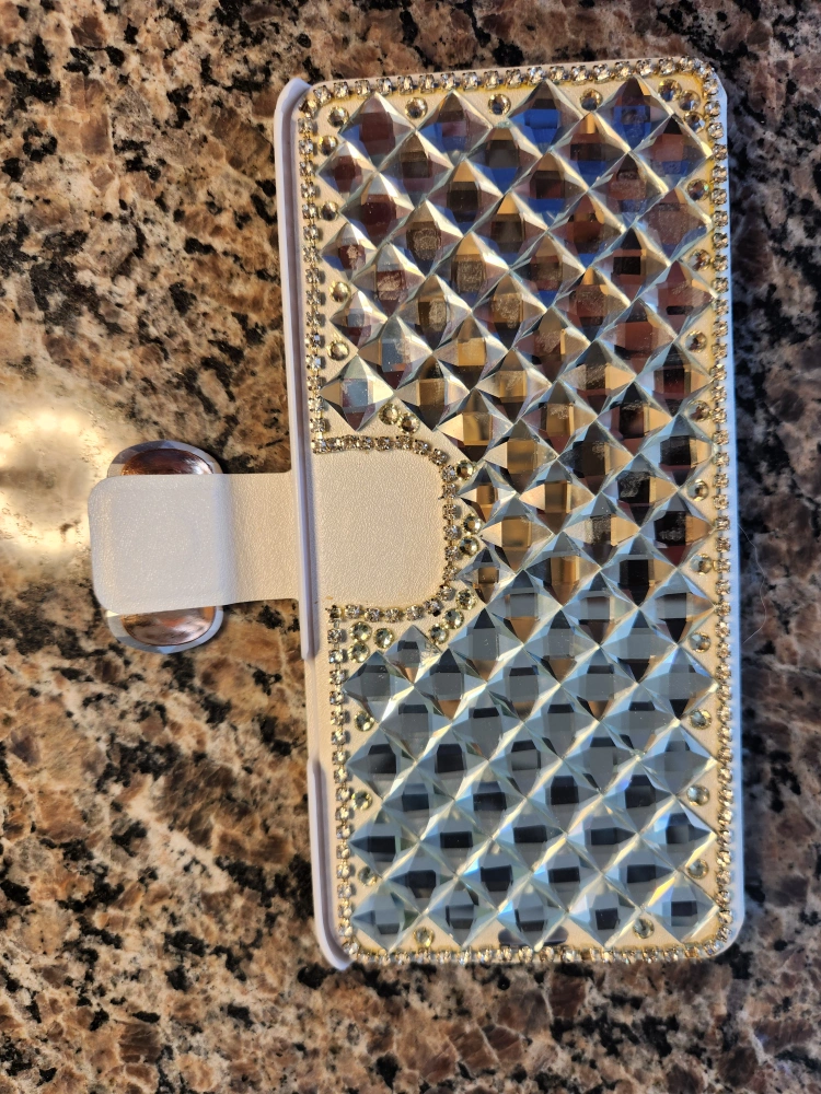 31Beautiful, sparkly phone case. White PU leather exterior. Rhinestone accents. Flap closure. Card slots inside. Compatible with Samsung Galaxy S9+