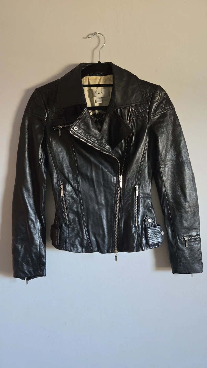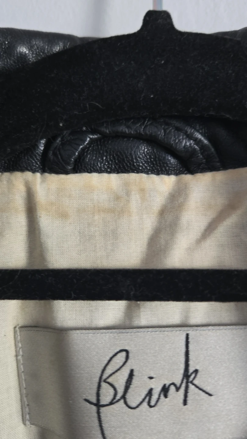26Black leather jacket made by Blink ♡ Stylish & Sexy ♤ Some light staining near the collar ♧ Gently used 🏡 Pick up in St. James /Silver heights 🐱 loved home Check out my other listings!