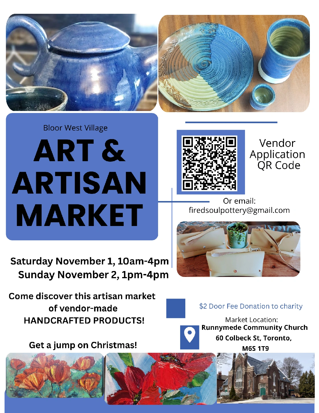 Local, handcrafted products (only) are for sale November 1, 10am -4pm & Sunday November 2 , 1pm -4pm @Runnymede Community Church Vendors apply firedsoulpottery@gmail.com