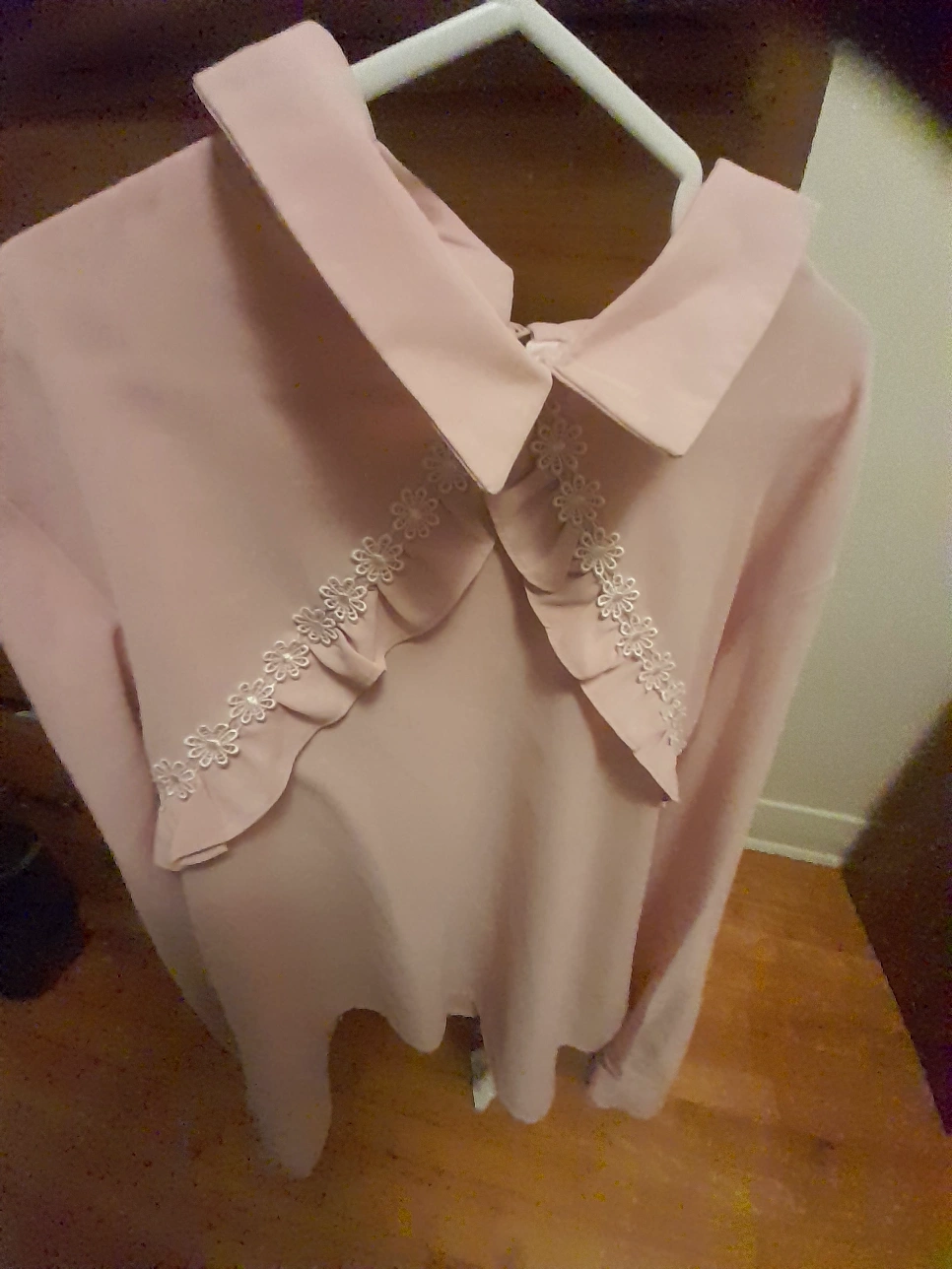 Jolie blouse rose pâle avec un col orné de petites fleurs blanches. Parfaite pour ajouter une touche de douceur à votre garde-robe!