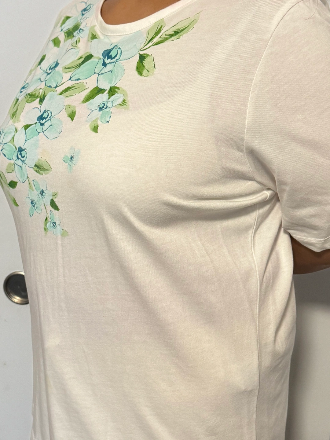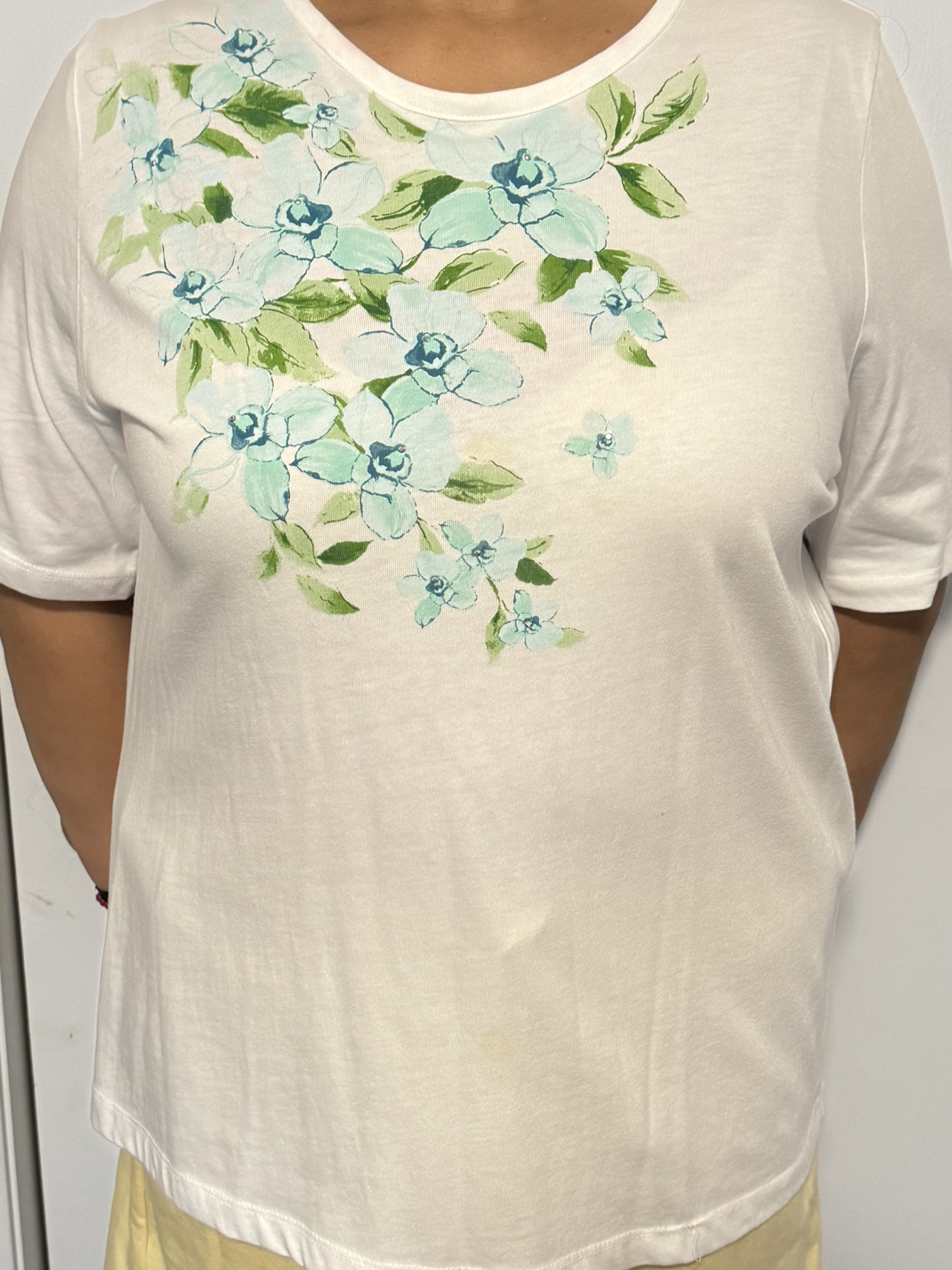 15White blouse with decorative leaves in the front cotton short sleeve .