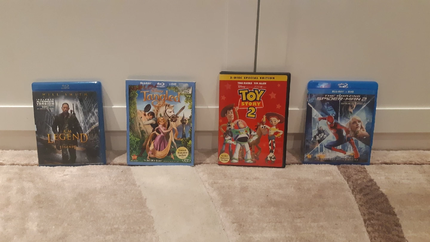 Selling a collection of Blu-Ray and DVD movies. Titles include Spider-Man, Toy Story 2, Tangled, War of the Worlds, and more! Great for family movie nights or adding to your collection. $5 each