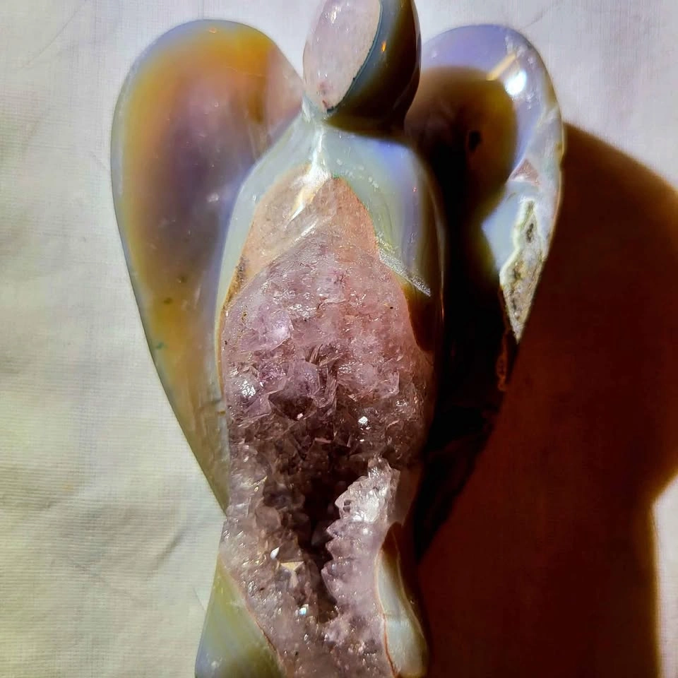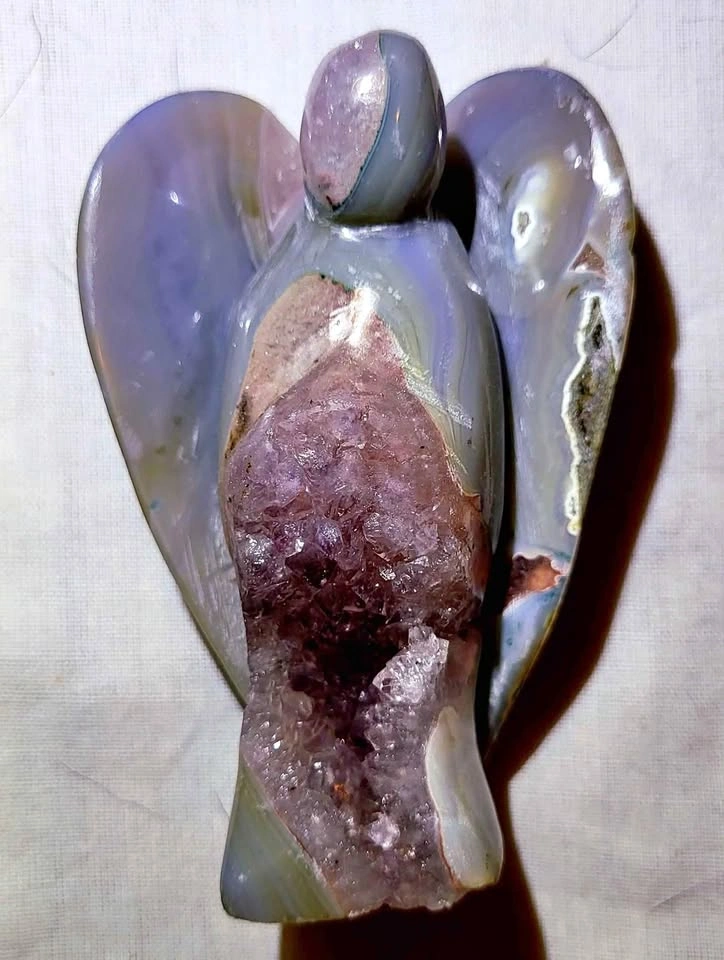 25This is a rare piece, a gorgeous hand cut blue lace agate crystal angel with sparkly open amethyst crystal druzy and amethyst crystals all around the angel's head and back. This is a one of a kind hand cut and polished piece and stands on her own on any flat surface. A great collection piece. Pick up any weekday after 1pm daily. Weekend pick ups can be arranged prior to that weekend. Pick up location is North Edmonton. Price is firm. I do not hold items unless paid for in full with a scheduled date for pick up. I only accept etransfer or cash upon pick up. No Trades. This is for sale only. This is not a wholesale piece. It is hand cut, carved and polished. It is not mass produced. I do not do wholesale. I do not give discounts as I am not a store. You would not find a piece like this in a retail store.