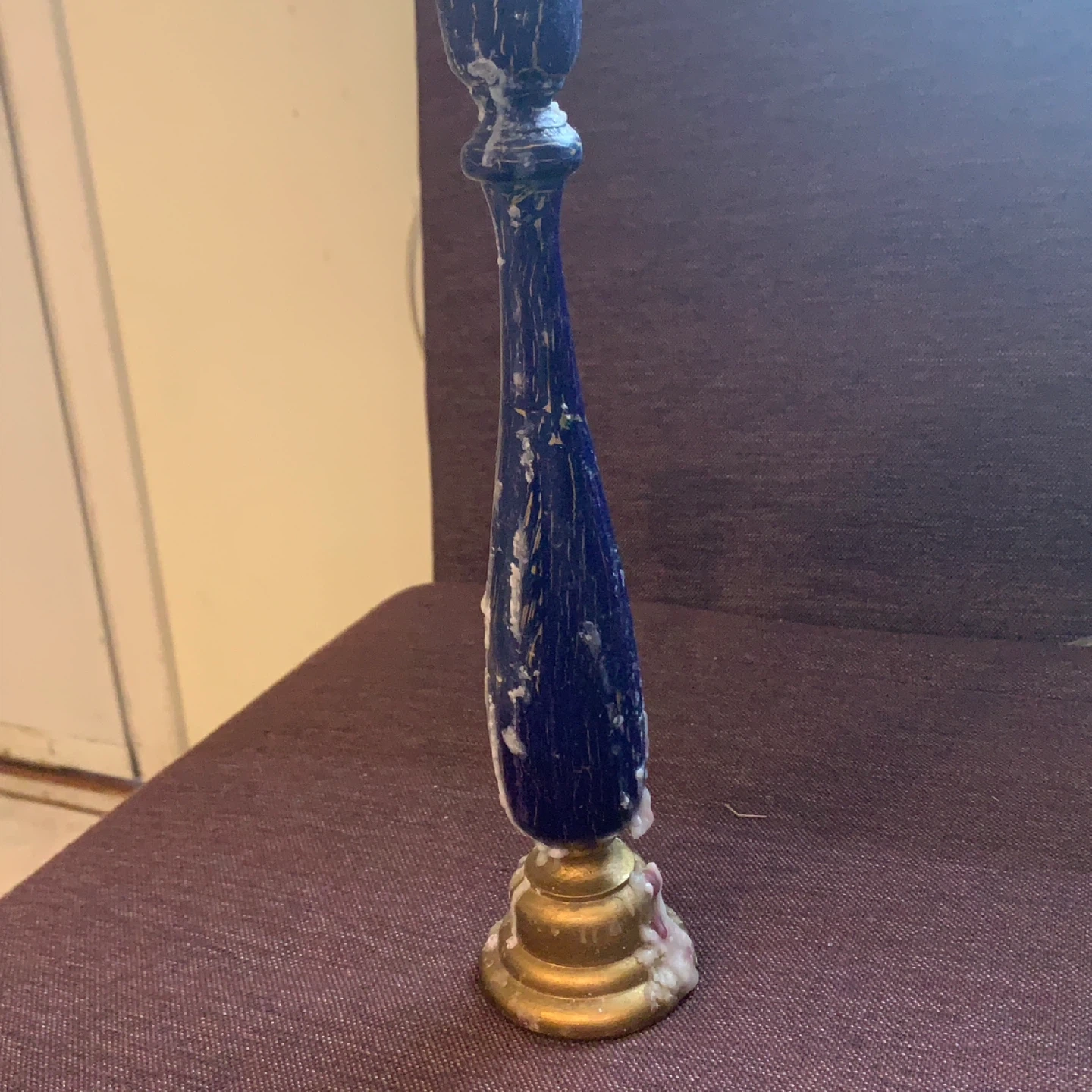 Selling a blue and gold candlestick holder. It has a unique design and would look great in any room. It shows some signs of use, with some wax residue, but is still in good condition