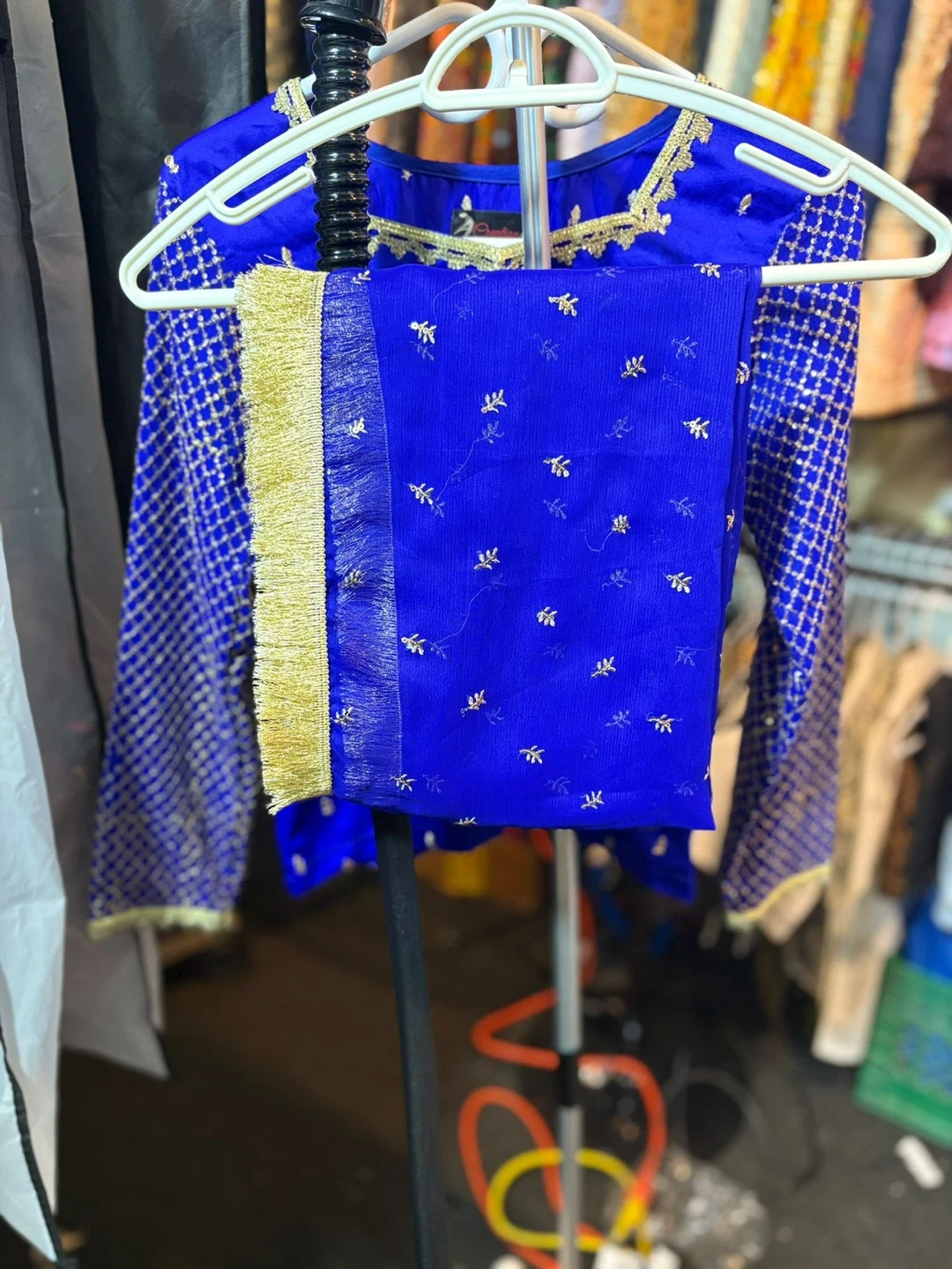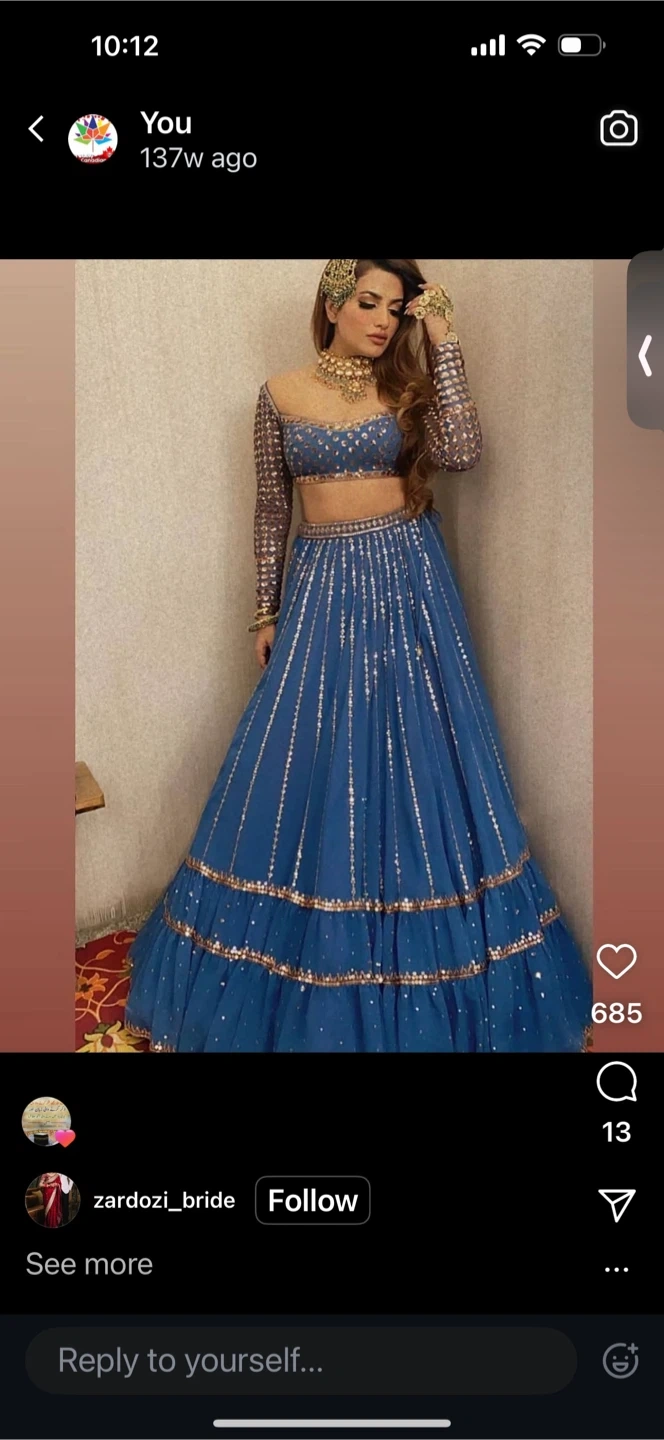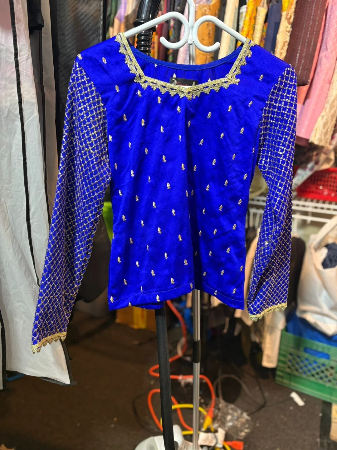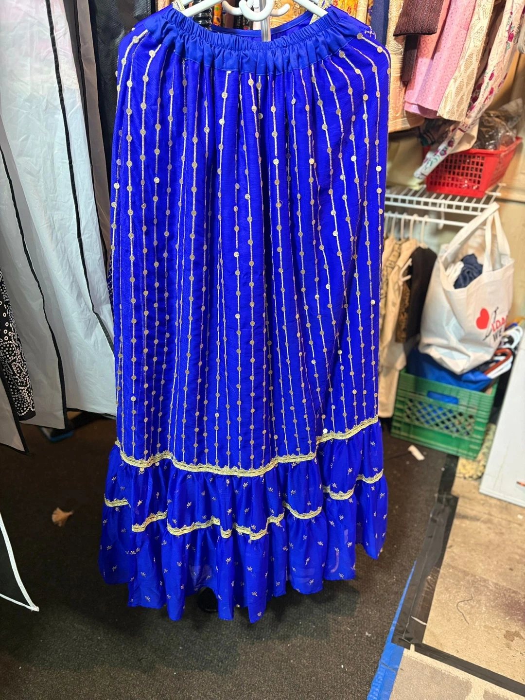 Beautiful blue lehenga skirt and top set with gold detailing! Perfect for a special occasion or festive event. The skirt has a lovely flow and the top is intricately designed. Both pieces are in great condition and ready for a new home