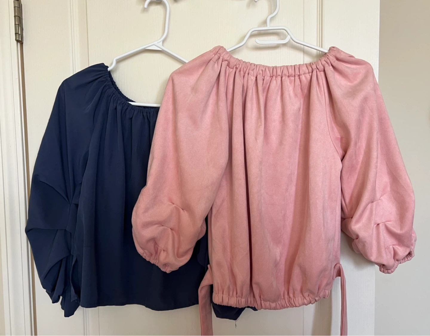 Selling two blouses, one in a beautiful blue colour and the other in a soft pink. Both are in great condition and ready for a new home! They feature a unique design that's both stylish and comfortable. Perfect for adding a pop of colour to your wardrobe