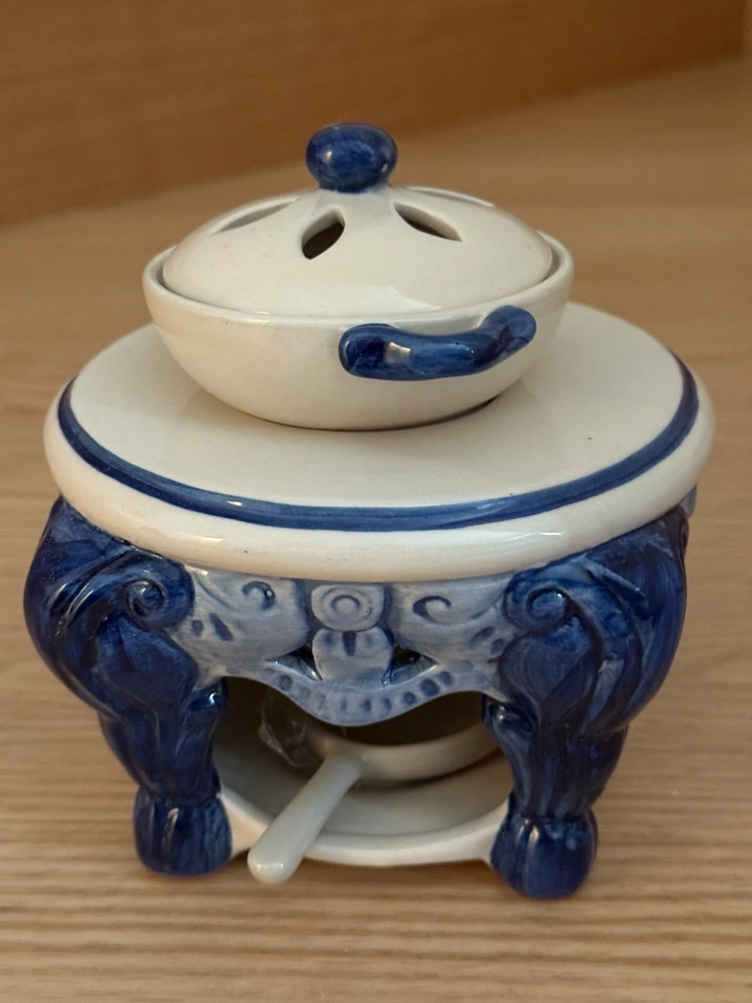 18This is a beautiful blue and white ceramic oil warmer. It would look great in any room of the house!