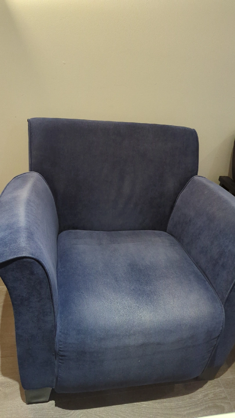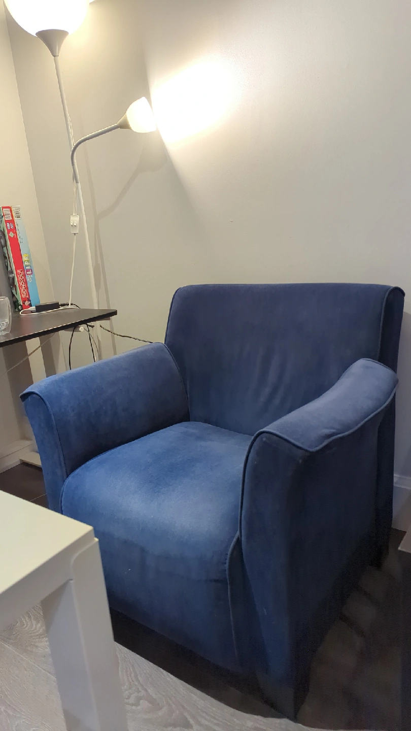 65Comfortable blue armchair in great condition! Perfect for adding a cozy touch to any room. The material is soft and the colour is a nice, deep blue.