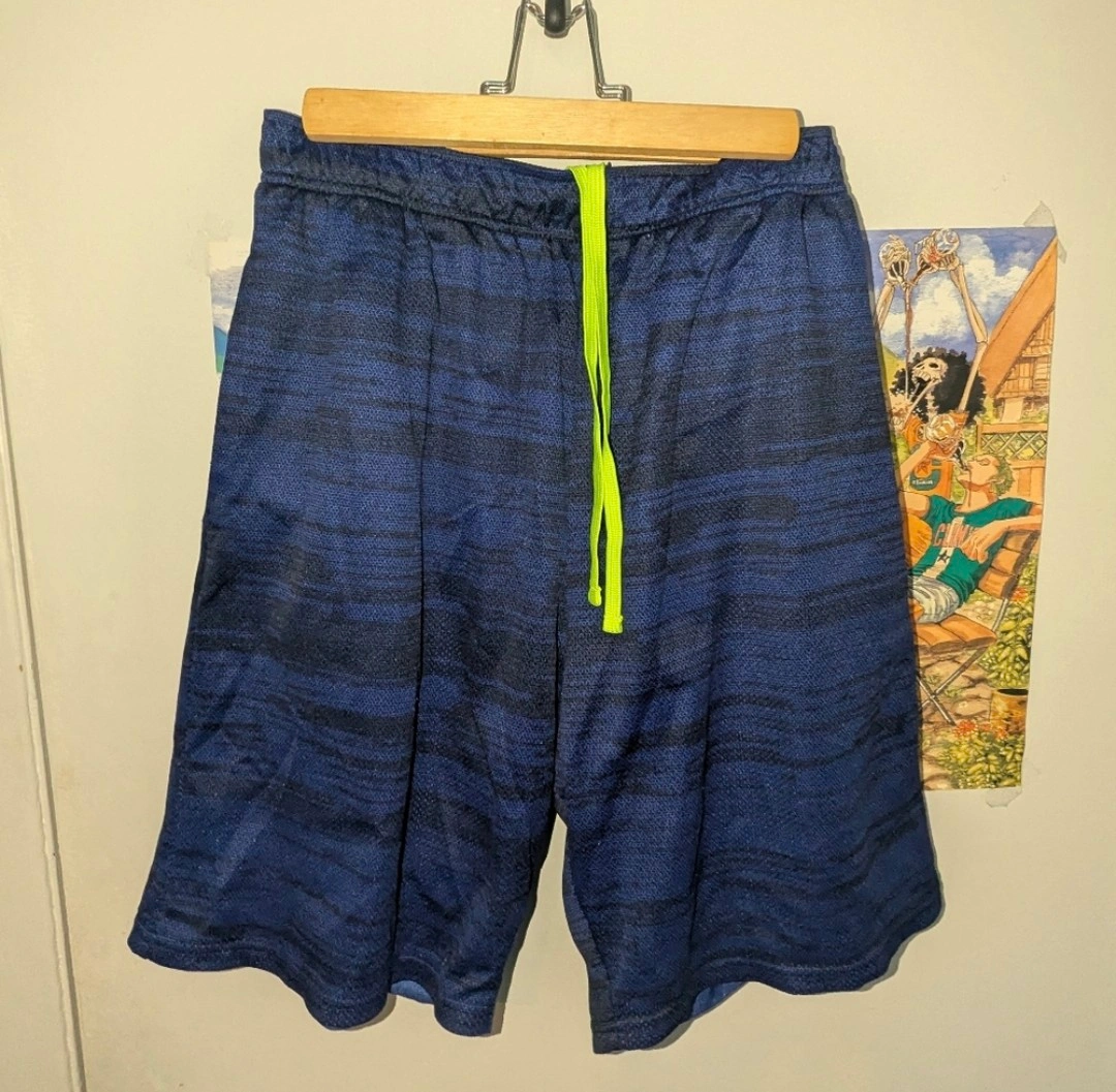 15Selling a pair of blue athletic shorts. They have a neon green drawstring. Perfect for sports or just lounging around!