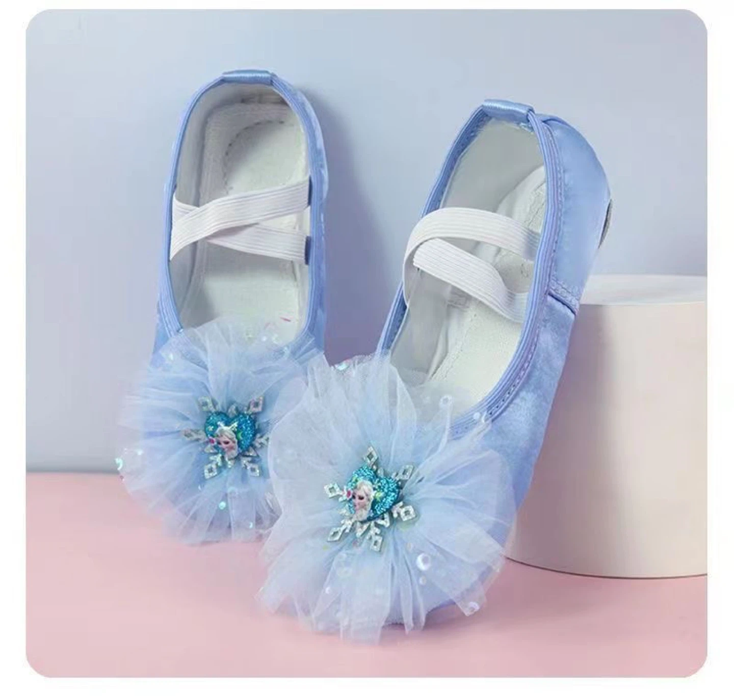 These adorable blue ballet slippers are perfect for your little dancer! They feature a cute Elsa-themed flower detail, adding a touch of magic to every step. Toddler size 11.5-12