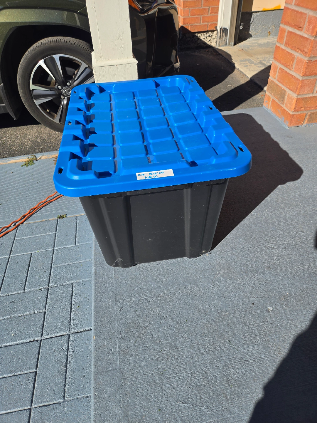 10Selling a large blue and black storage bin with a lid. It's in great condition and perfect for storing items in your garage or basement! It is made of durable plastic. Size: 28x20x16" Never used.