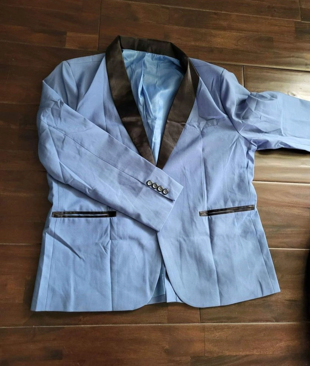 A stylish blue blazer featuring a sleek black lapel. Perfect for adding a touch of sophistication to any outfit. New, size large. Pu from Cambridge. Sf/pf home. $6