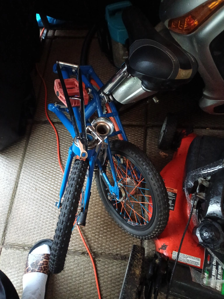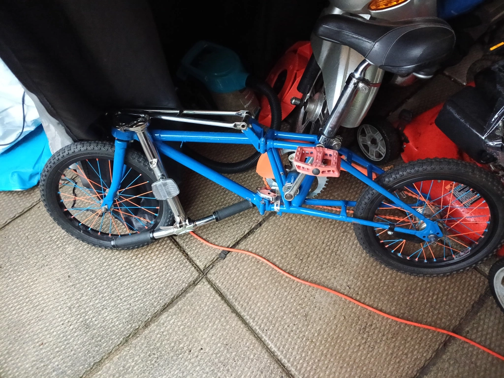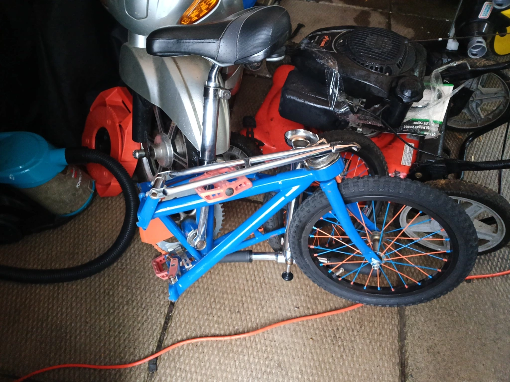 Selling my foldable blue bike! It's in good condition and ready for some fun rides. The frame is a vibrant blue with orange and blue spokes. Perfect for both adult and kids or anyone looking for a cool bike to cruise around on, save space and easy to carry while transporting.