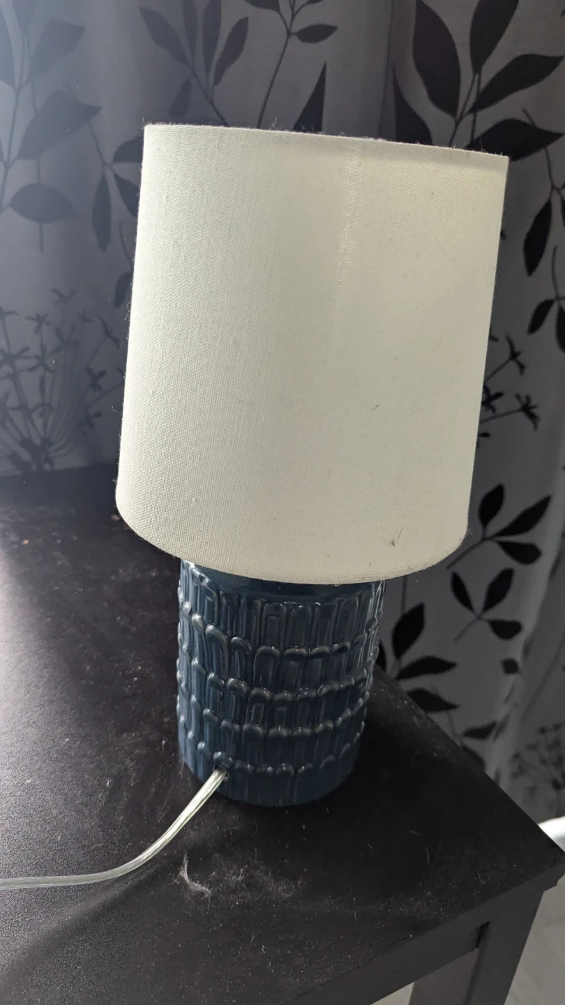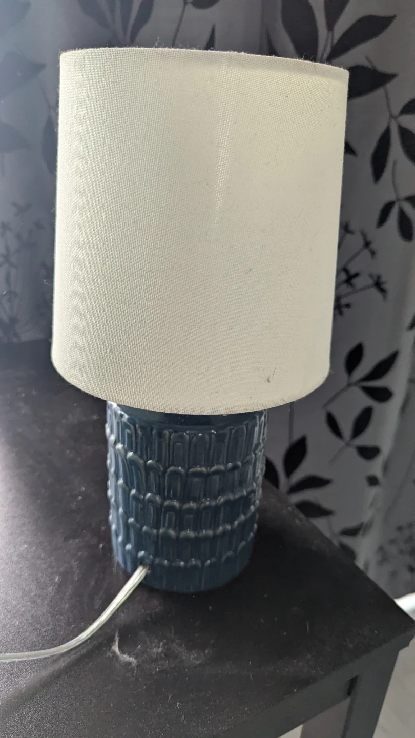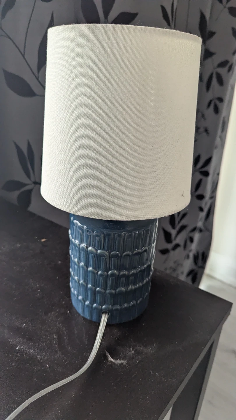 86Selling a cute table lamp that would look great in any room! It features a blue ceramic base with a textured design and a simple white shade. It's in great condition and provides a nice ambient light. Note: it does not include the bulb. Pickup only